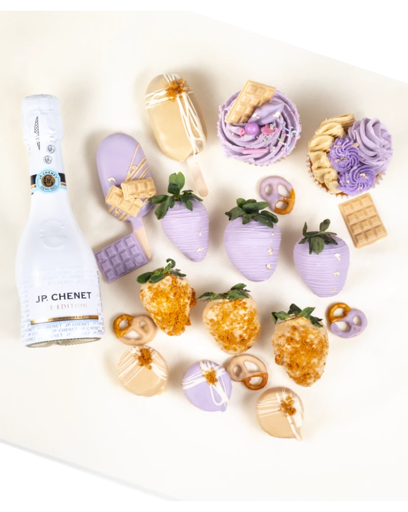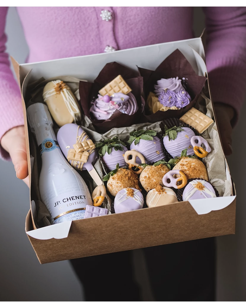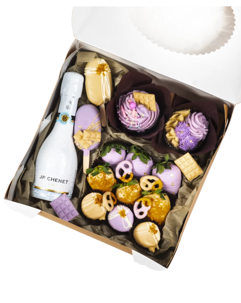 Dárková krabička obsahuje originální dobroty - čerstvé jahody a banány v čokoládě, dortové nanuky, cupcakes s krémem a malou lahvičku prosecca. Pokud chcete jako dárek poslat své ženě, kamarádce či známé výběr těch nejlepších delikates z Frutika, doporučujeme právě tuto dárkovou sadu. Obsahuje totiž ty nejlepší laskominy - jahody a banány ve fialkové a zlaté belgické čokoládě, cupcakes bohatě zdobené lahodným krémem z mascarpone a belgické čokolády, mini dortíky na špejli a šumivé víno JP: Chenet.