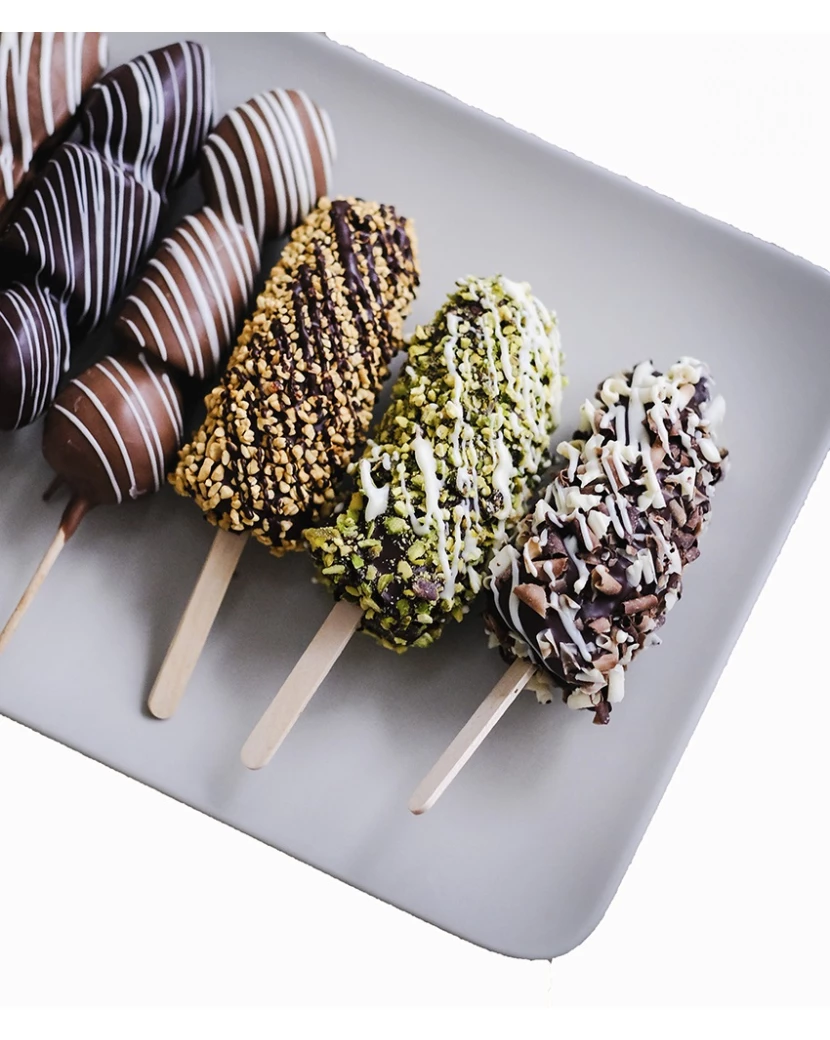 Banán v čokoládě je jedním z nejoblíbenějších českých dezertů a prodává ho každá cukrárna. Naše čerstvé banány v belgické čokoládě napíchnuté na špejli jako nanuk jsou ozdobené oříšky, pistáciemi a čokoládovými kousky. Čerstvé banány v čokoládě jsou opravdu vynikající a také zdravé, obsahují draslík a dodají Vám vitamíny i energii.