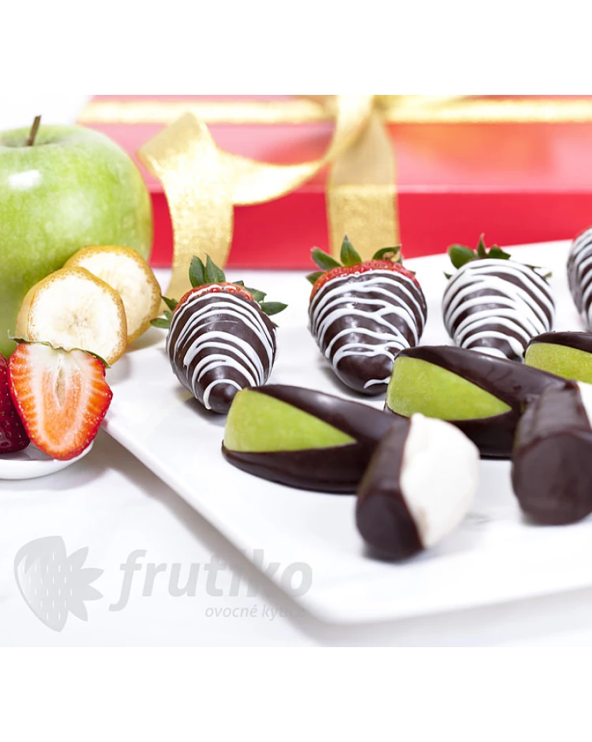 Bonboniéra Ovocný mix je luxusní čokoládová bonboniéra vytvořená z nejrůznějších druhů čerstvého ovoce namočeného do kvalitní čokolády. Tato čokoládová bonboniéra obsahuje výběr z nejkvalitnějšího ovoce – zelených jablek, čerstvých jahod a kousků sladkého banánu namočených do kvalitní bílé a tmavé čokolády. Standardní bonboniéra obsahuje 15 kousků ovoce v čokoládě velká 20 kousků. Vyzkoušejte luxusní čokoládové bonboniéry Frutiko! Pokud chcete zkusit i jiné chutě než jahody a banán, pak oblíbená bonboniéra Čokoládové koule v sobě ukrývá jablka, hrušky a meloun kantalup.