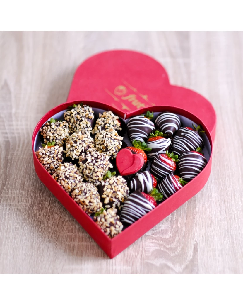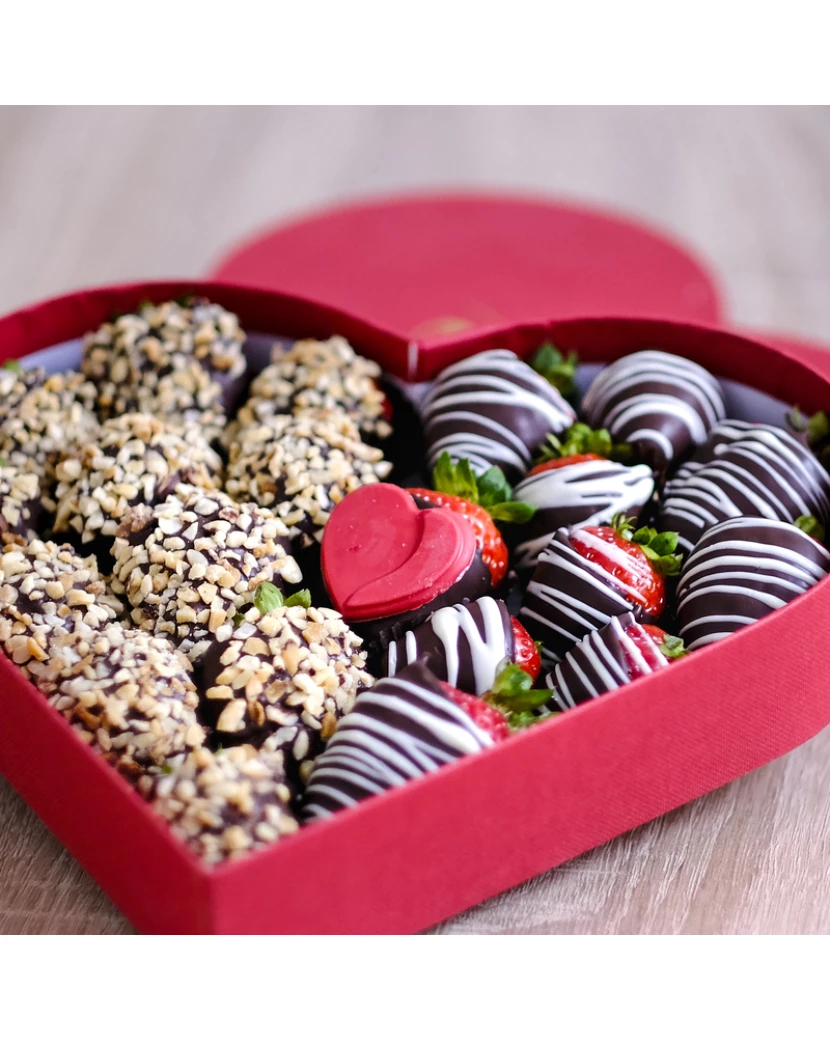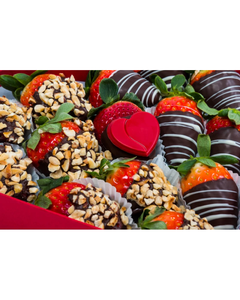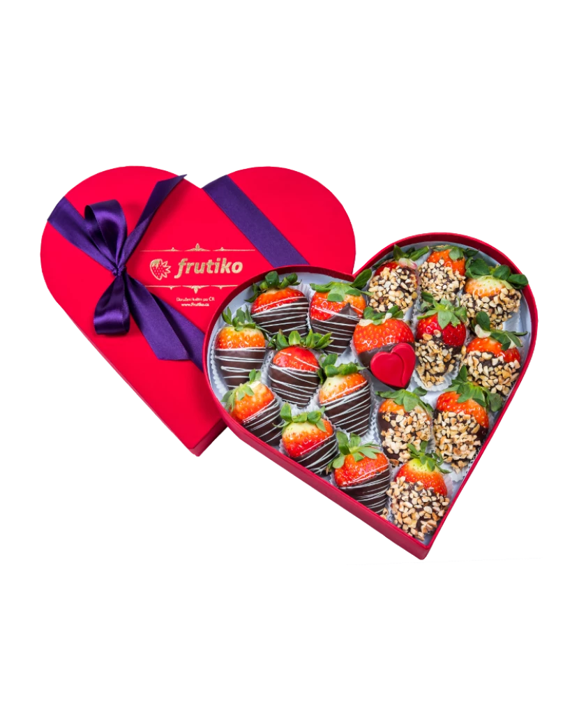 Ovocná bonboniéra Jahodové srdce je jednou z našich originálních bonboniér, které Frutiko nabízí jako skvělý dárek z lásky, třeba k Valentýnu. Dárek se bude hodit jako dárek pro muže i ženy všeho věku. Jedná se o vitaminovou bombu plnou šťavnatého ovoce a lahodné čokolády: Bonboniéra obsahuje velké kousky čerstvých jahod namočených do kvalitní hořké čokolády Callebaut. Jahody jsou poté ještě ručně namáčené také do směsy ořechů a dekorované žíháním z bílé čokolády. Standardní bonboniéra jahod v čokoládě obsahuje 15 kousků ovoce, velká 20 kousků jahod. Naše výrobky z ovoce jsou vyráběny vždy v den rozvozu. Garantujeme 100% čerstvost našich výrobků.
