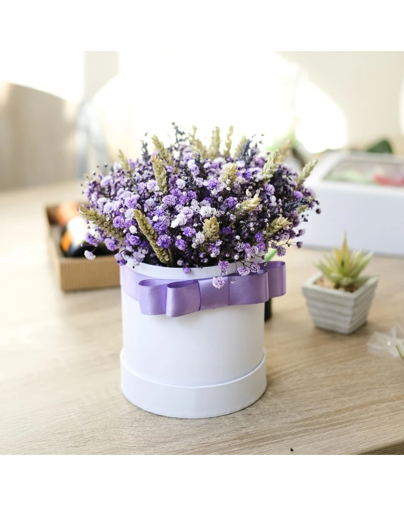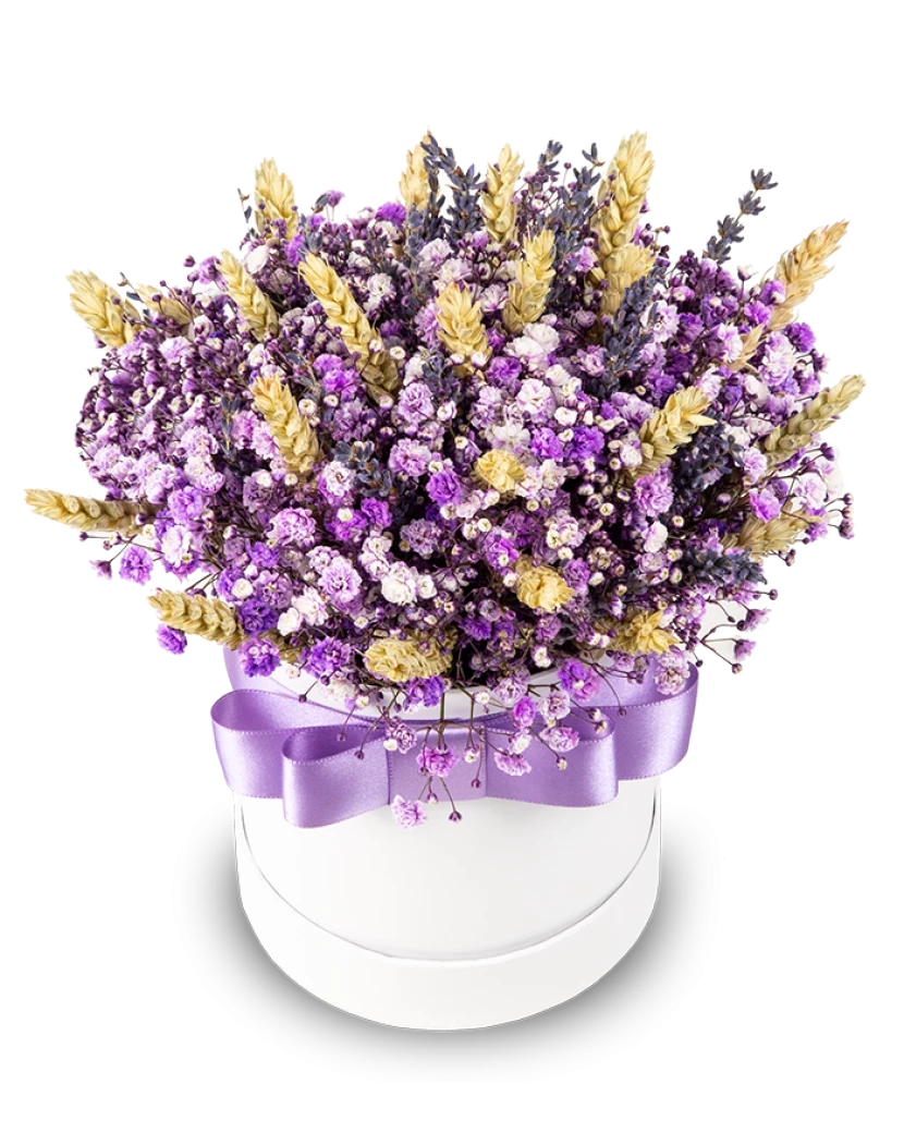 Gypsophila - Šater neboli Nevěstin závoj kvete drobnými bílými, růžovými nebo fialovými kvítky. Kytice Gypsophila je velmi oblíbená pro její jemný a decentní vzhled a to nejen do svatební kytice s gypsophilou, ale také do míchaných květin jako přizdoba. Tento Flowerbox neboli květinová krabice zdobí fialová a růžová gypsofila a také sušené květy levandule a prosa. Naše floristky vám rádi připraví také velkou kytici gypsophily v jakékoli barvě, existuje i barevná duhová gypsophila. Všechny květiny doručujeme čerstvé chlazené kamkoli po rebublice dárkově balené s blahopřáním.