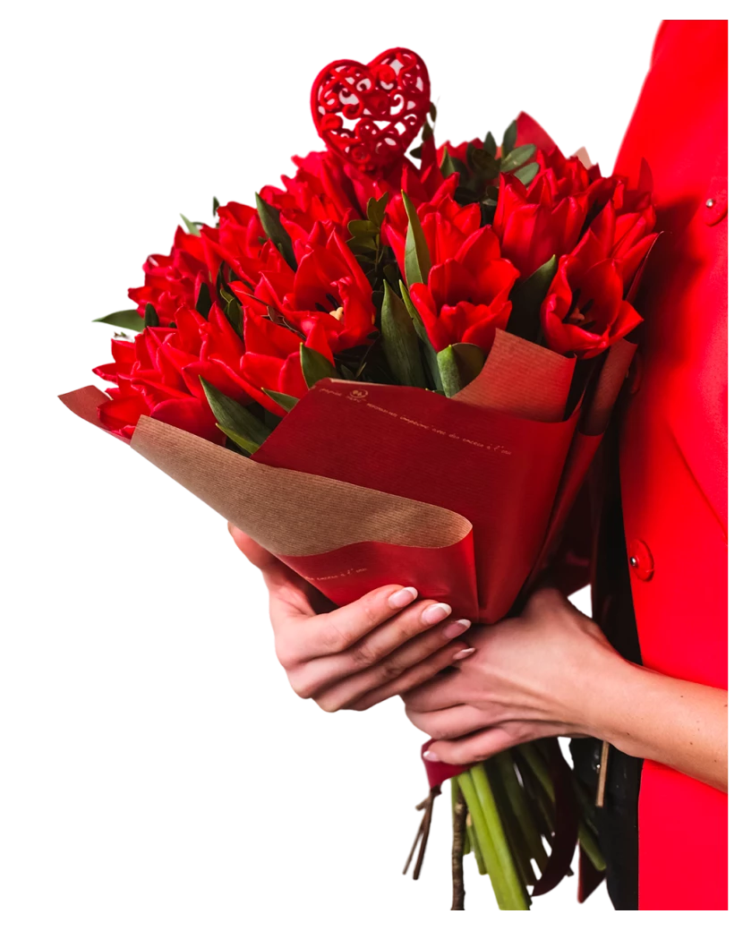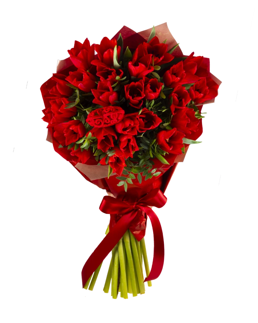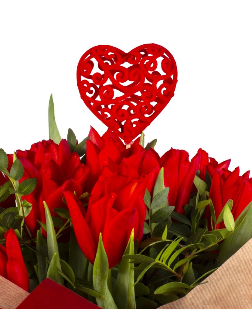 Krásné velkokvěté tulipány jsou jednou z nejoblíbenějších květin spolu s růžemi, karafiáty a gerberami. Holandské tulipány bereme od prověřených dodavatelů přímo z holandské burzy, máme tedy jistotu, že jsou čerstvé a velmi pěkné. Vážeme je do pugétů nebo je vkládáme do elegantních květinových krabiček neboli flowerboxů. Tato kytice z červených tulipánů je zdobená ještě zelenými větvičkami pistácie a zápichem ve tvaru srdce. Puget je zabalený do floristického dekoračního papíru.