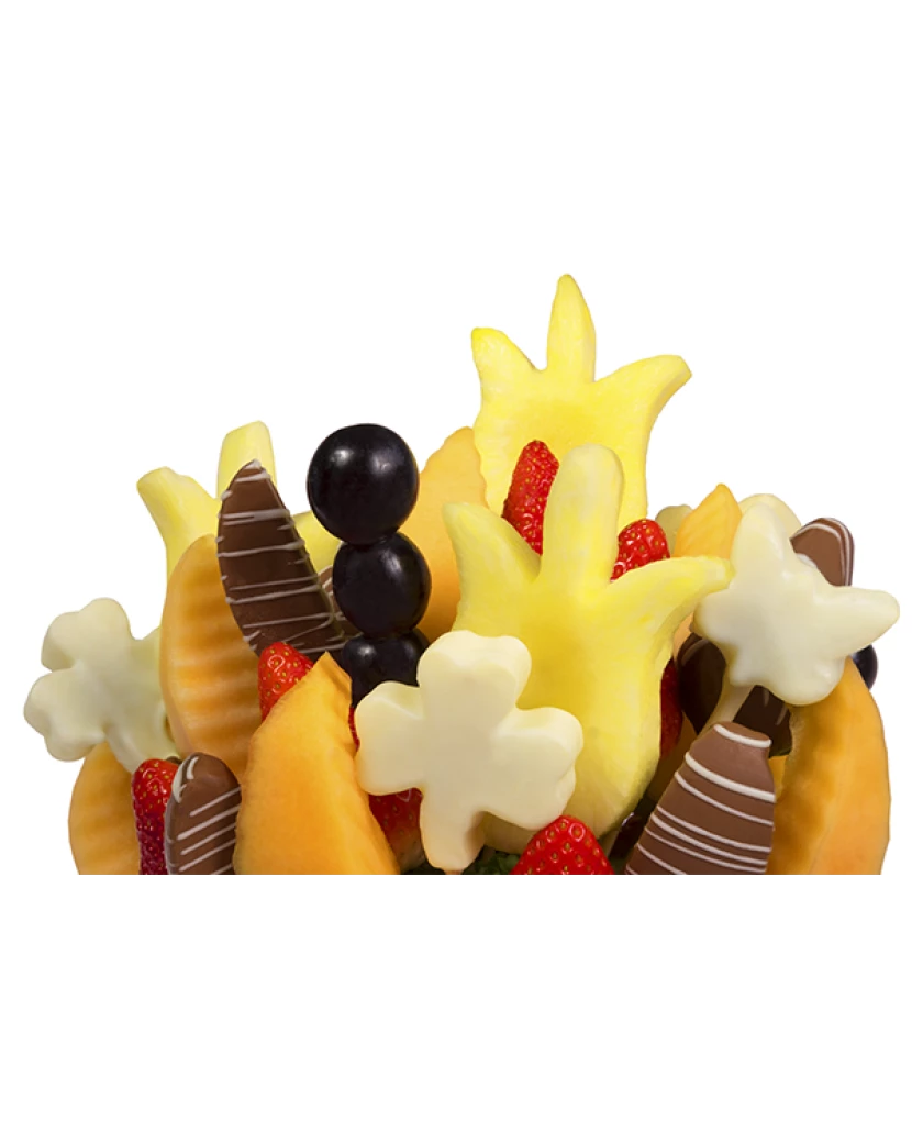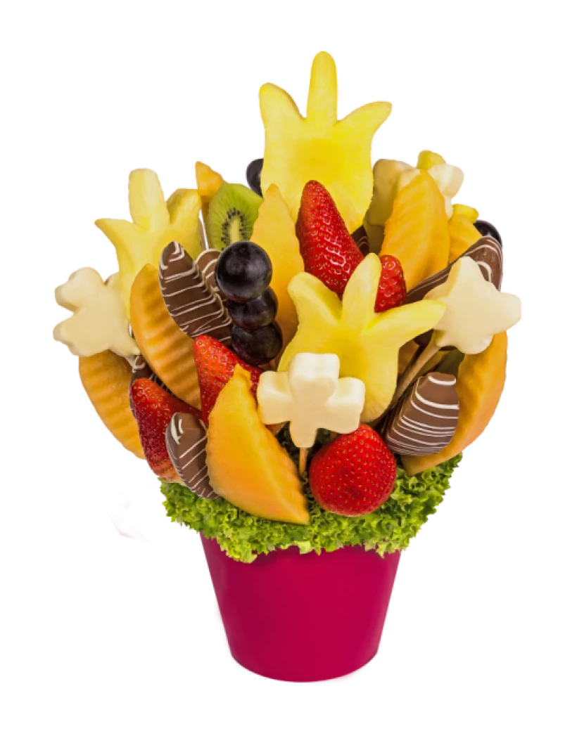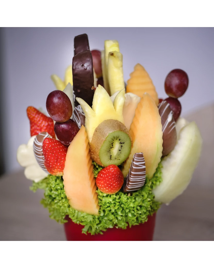 Čokoládová kytice tulipánů potěší všechny Vaše smysly.Kombinace čerstvého ovoce a pravé belgická čokolády udělají z jedlé kytice nezapomenutelný zážitek. Tulipány patří neodmyslitelně k jaru. Ale vy si je můžete užít po celý rok a ještě originálním způsobem. Netradiční čokoládová kytice je vytvořená z ananasu ve tvaru tulipánů, jablek Granny Smith, jahod, pomerančů, kiwi, banánů a hroznového vína. Udělejte radost například k výročí, k narozeninám, nebo jen tak pro radost.