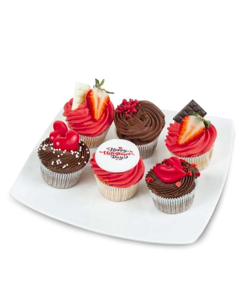 Nejlepší recept na valentýnské zamilované cupcakes je jasný - objednat je online z pohodlí domova a nechat je doručit své lásce jako originální a lahodný dárek k Valentýnu. Tyto luxusní muffiny jsou zdobené čokoládovým krémem, čokoládovými ozdobami a posypky ve tvaru srdíček a pusinek a čerstvými jahodami. Jeden cupcake je ozdobený vzkazem Happy Valentines Day (Veselého Valentýna), který je vytištěn jedlým tiskem na jedlém fondánovém papíře.
