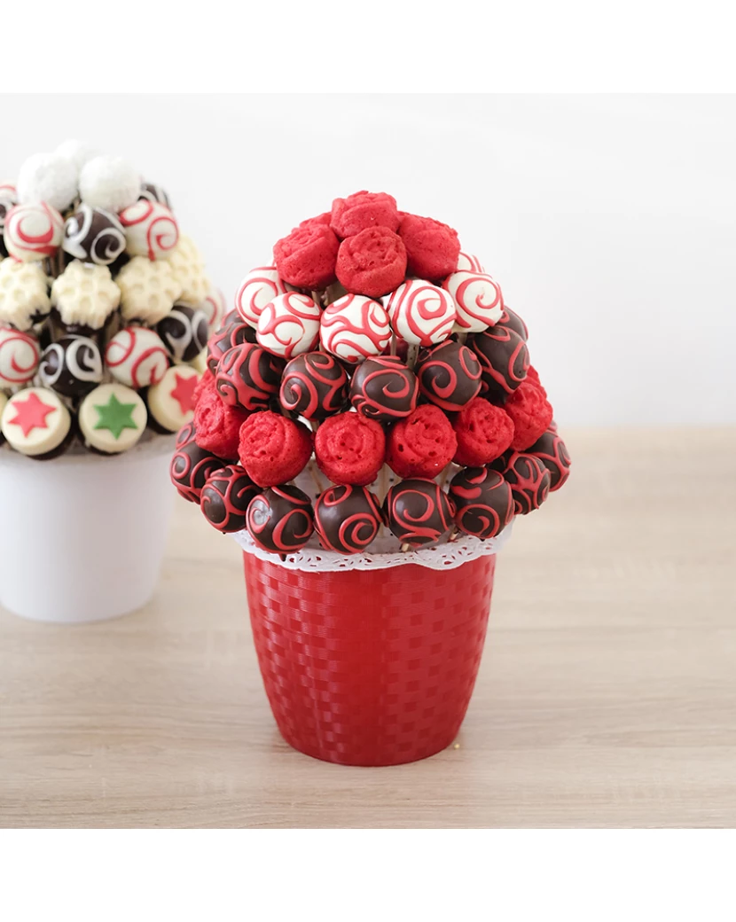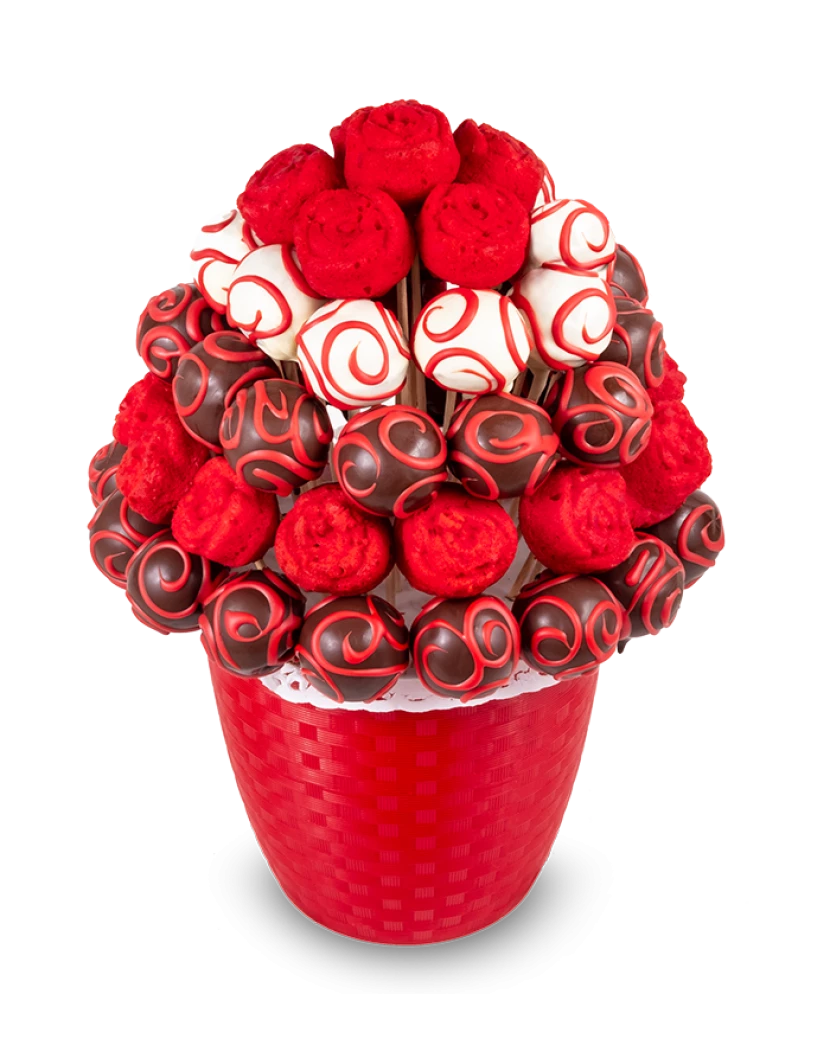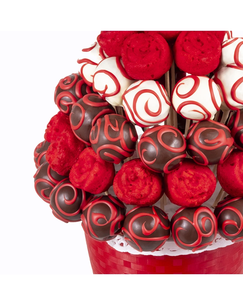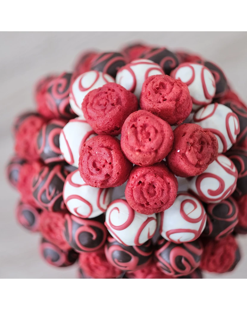 Dortová kytice v ďábelských barvách z výborných kakaových popcakes zdobených bílou, červenou a tmavou čokoládou a rudých muffinových růží.