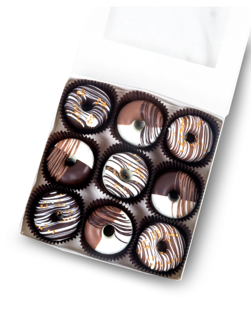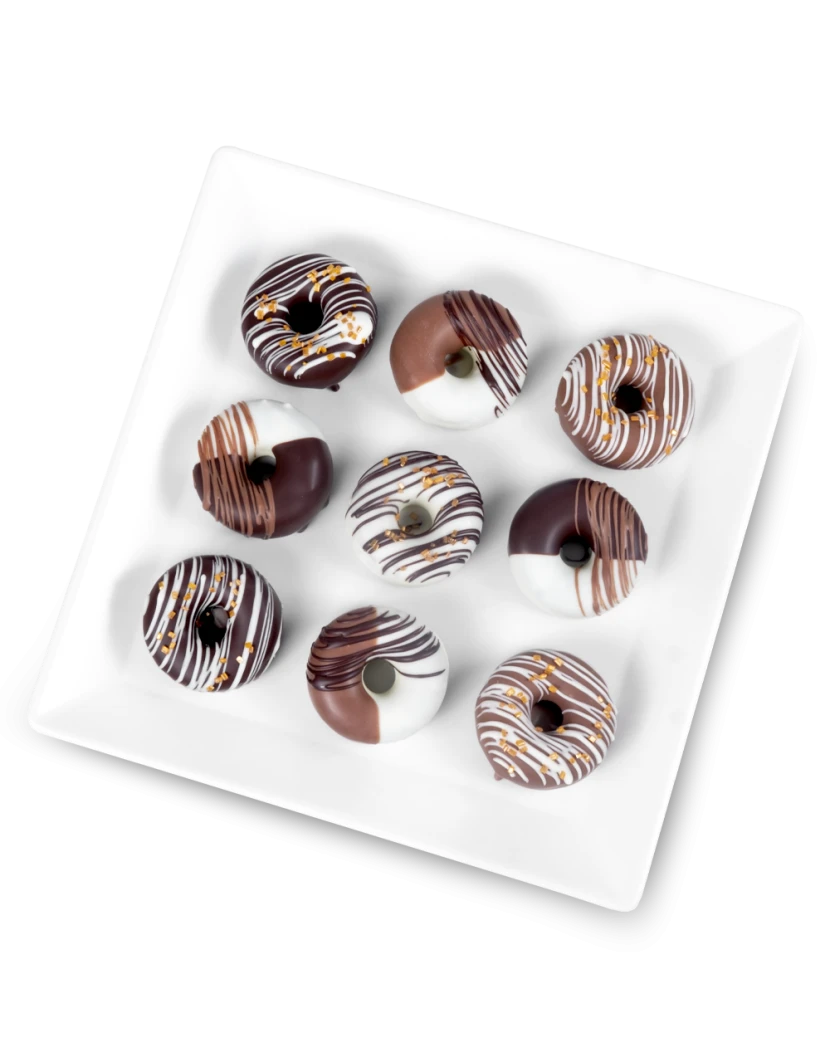 Tyto donuty neboli malé koblížky nejsou z čerstvého ovoce, ale jsou zdobené belgickou čokoládou. Donuty jsou vytvořené jako popcakes z rozdrceného piškotového těsta smíchaného s krémem z mascarpone a belgické čokolády. Pro zdobení je použita bílá, mléčná, tmavá čokoláda a cukrové krystalky.