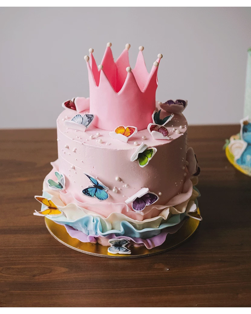 Dětský dort pro holčičky zdobený růžovou fondánovou korunkou a motýlky vytištěnými jedlým tiskem na jedlý papír si můžete objednat v mnoha příchutích. Například světlý nebo kakaový piškot, ale také red velvet či bezmouková verze. Krém na dort připravujeme z mascarpone a belgické čokolády, nebo z tvarohu či zakysané smetany. Uvnitř dortu najdete čerstvé ovoce - jahody, banány, lesní ovoce nebo mix. Všechny naše dorty jsou chuťově vynikající, protože používáme poctivé suroviny. Vzhled dortu upravíme dle vašich přání.