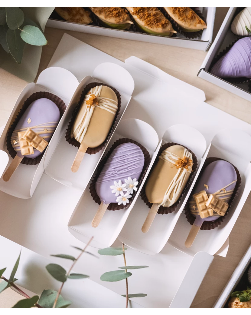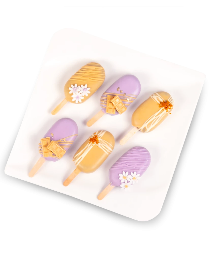 Pečené nanuky z dortového těsta jsou novinkou mezi dezerty. Není to klasická zmrzlina, ale naopak zákusek, vytvořený z piškotového těsta (korpusu), rozdrobeného a smíchaného s lahodným krémem z mascarpone a belgické čokolády. To vše je obaleno a namočeno do lahodné světle fialové a zlaté karamelové čokolády a dozdobeno čokoládovými ozdobami, cukrovými perličkami a fondánovými kytičkami. Tyto elegantní a originální mini dortíky na špejli se hodí nejen jako dárek, ale také jako občerstvení na svatbu či jinou společenskou akci.