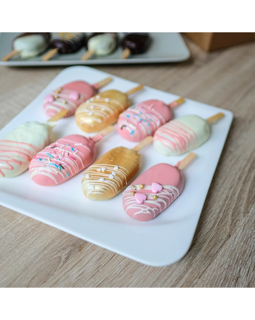 Slyšeli jste někdy, že existují pečené dortové nanuky? Recept na nanuky z těsta je jednoduchý, rozdrolit jakékoliv upečené těsto či korpus smíchat ho s krémem či marmeládou, na zatuhnutí použít silikonové formy na nanuky a ozdobit roztátou čokoládou. Naše nanuky jsou vyrobené z piškotového těsta, mix světlého, kakaového a red velet. Mícháme ho s krémem z mascarpone a čokolády. Zdobíme je belgickou čokoládou a barevnými cukrovými posypy.