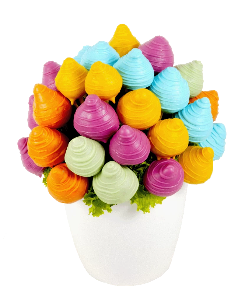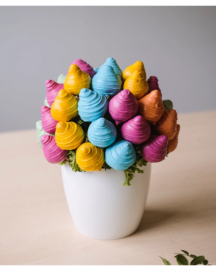 Duhová kytice jahod je originální a zdravý dárek k narozeninám, na dětskou oslavu i jiné významné události. Jahodová kytice plná čerstvých sladkých jahod okouzlí především ty, kteří milují jahody a čokoládu. Česrtvé jahody naaranžované do krásné kytice potěší všechny a nabízí sladké překvapení i krásný vzhled. Zdravá pozornost plná vitaminů s doručením přímo k vám je ideální dárek. Ovocná kytice je originální dezert, který skvěle doplní také duhové jahody a banány nebo barevný dort.