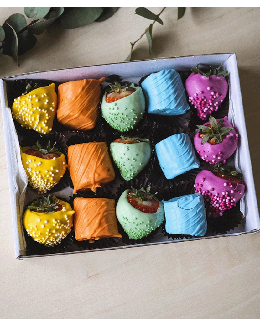 Čerstvé ovoce v čokoládě z kvalitní belgické čokolády je skvělé jako malý dárek či poděkování. Naše luxusní bonboniéry obsahují nejen kvalitní belgickou čokoládu Callebaut, ale narozdíl od klasické bonboniéry i čerstvé ovoce plné vitamínů. Tato bonboniéra je plná šťavnatých jahod a slaďoučkých banánů, které jsou zdobené barevnou čokoládou. Tato kombinace potěší všechny - muže, ženy, velké i malé. Je to ideální dárek pro děti, protože ty duhovou čokoládu milují. Čerstvé jahody a banány jim navíc dodají spoustu vitamínů. Jahody obsahují vysoké množství vitamínu C a banány zase cenné minerály jako draslík a hořčík.