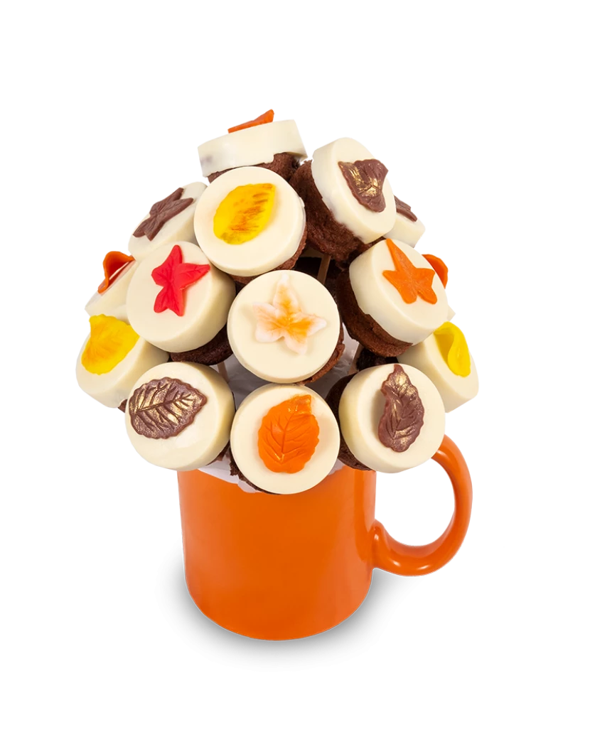Cake flower Autumn Miniflower from fresh baked muffins and pop cakes decorated with dark and white chocolate and nuts and coconut will please as a gift to any occassion and also just for a nice day as a sweet breakfast. Cake bouquets Frutiko are made from quality ingredients as milk, butter, oil, eggs and flour always fresh and can be delivered as gift everywhere in Cezch republic every working day.