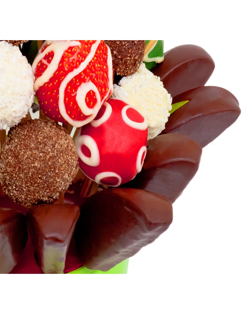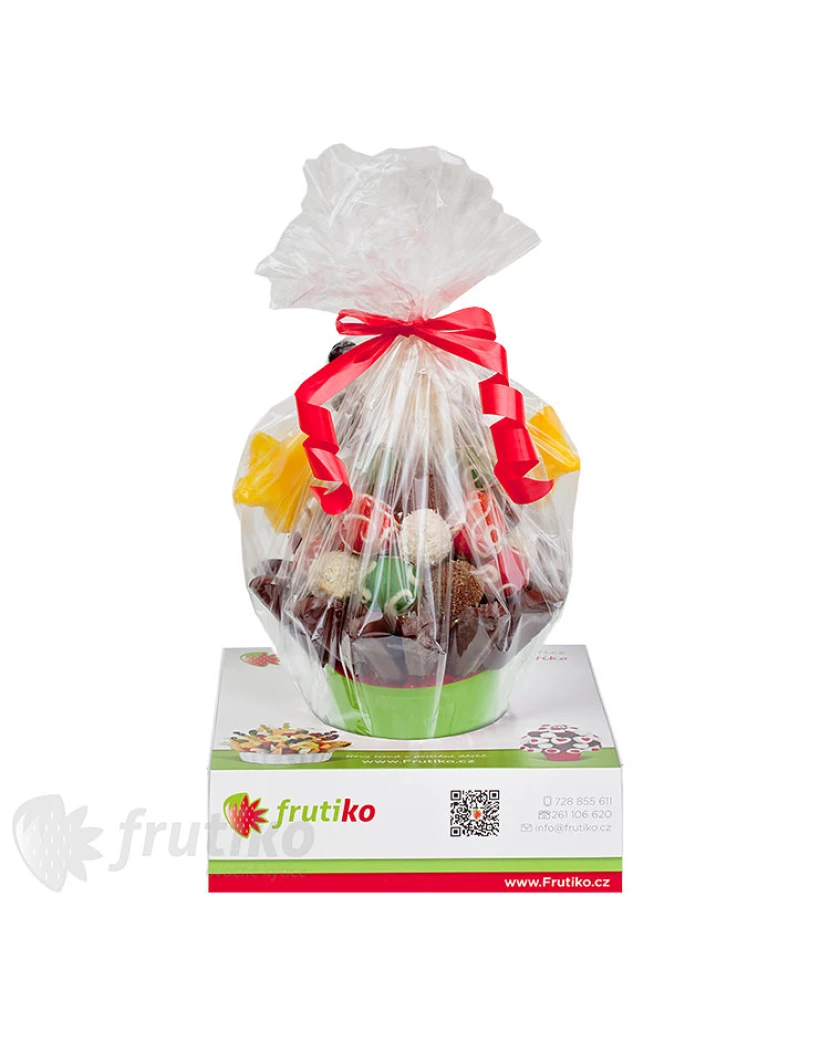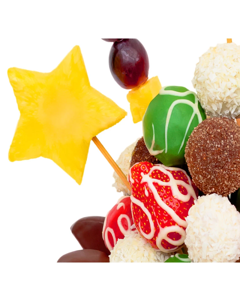 Nothing combines the bouquet and the Christmas as much as our Christmas Star. If you would like to give your close friends a flower that will not fade, pamper them with Choco-Flower pleasing the eye and the health. The donee does not have to find out how to grow it, he just has to decide which one of those delicious pieces he will taste as first. We have dipped apples and strawberries in chocolate and some pieces are decorated with nuts and coconut. The dominating feature of this bouquet is the Christmas star made of pineapple alternated with trees made from grapes. Its glamour predestinates it not only for Christmas parties, it will please also children.