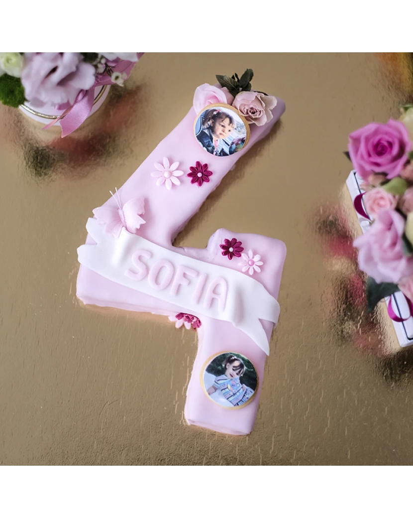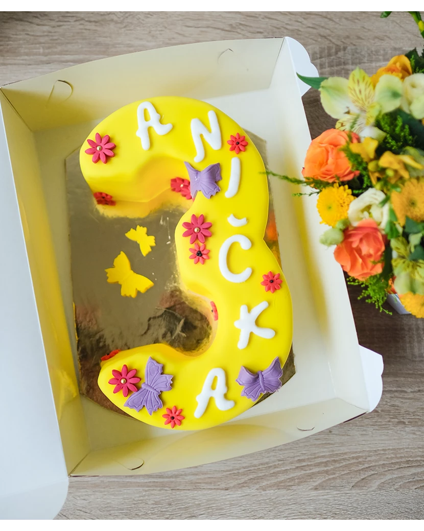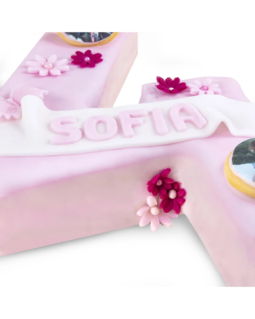 Kdo by odolal tomuto krásnému dortu, který je potažen mandlovým fondánem a ozdoben osobními fotografiemi? Tyto fotografie jsou vytištěné jedlými barvami na jedlý papír a vytvoří wow efekt celého dortu. Dort je pečen z kvalitních surovin a můžete si vybrat jaký korpus, krém a ovoce budete uvnitř dortu chtít. Dorty ve tvaru čísel jsou velmi oblíbené jako dorty k narozeninám. Kromě tohoto dortu ve tvaru číslice potaženého fondánem máme v nabídce také klasický nahatý dort ve tvaru čísla z křehkého těsta, který ale doručujeme jen po Praze a okolí.