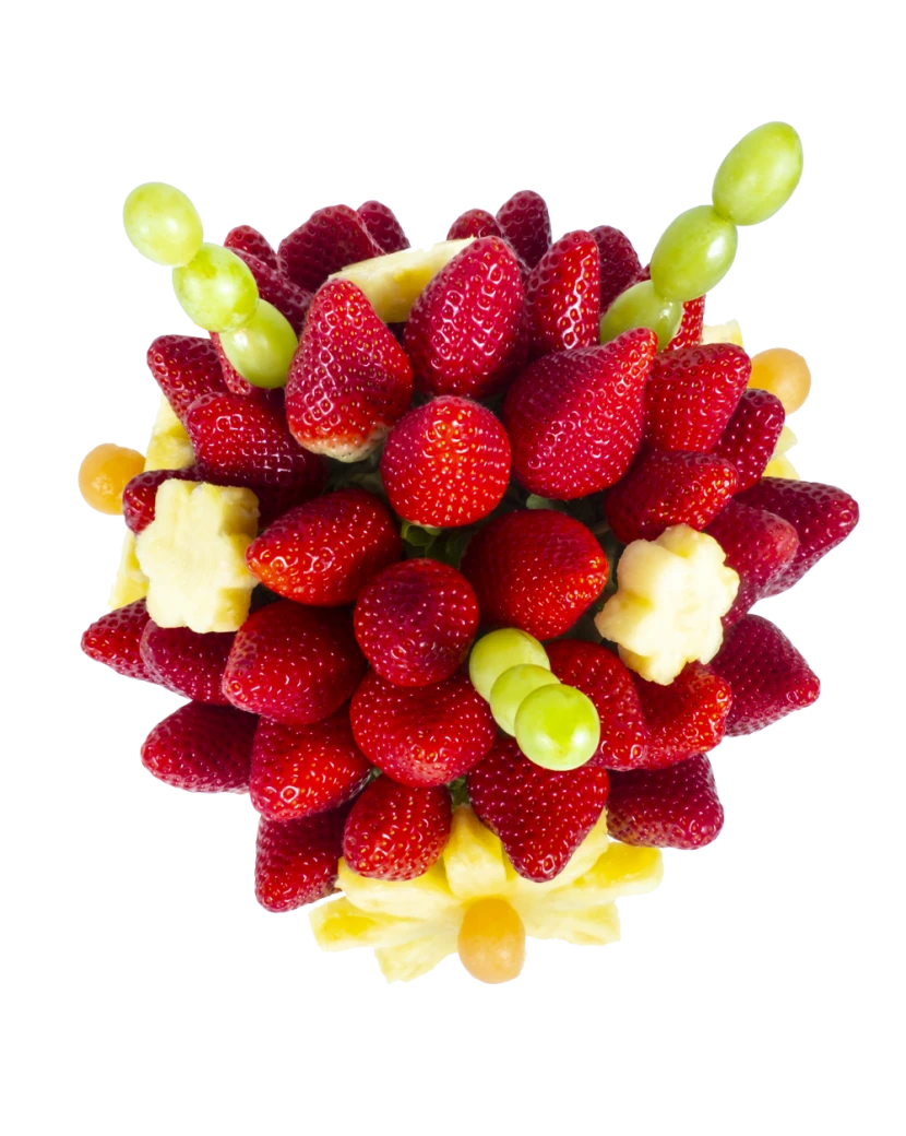 Tato Jahodová kytice je připravovaná z těch nejsladších a nejčerstvějších jahod, ananasu a hroznového vína. Česrtvé jahody naaranžované do krásné kytice každého potěší a nabízí sladké překvapení i krásný vzhled. Originální a zdravá pozornost plná vitaminů s donáškou kurýrem po Praze je ideální jako překvapení pro vašeho partnera či partnerku, dárek k narozeninám, k výročí i jiné významné události. Ochutnejte lahodnou zdravou pochoutku z čerstvého ovoce v podobě krásné ovocné květiny.