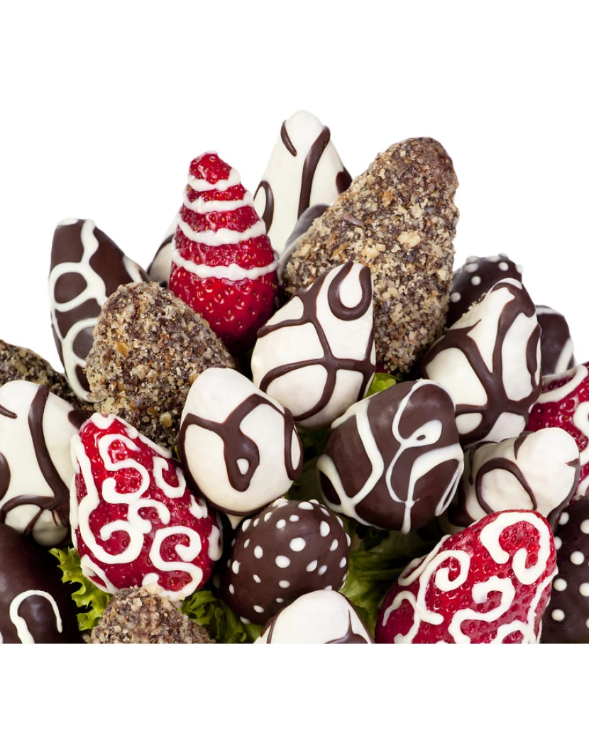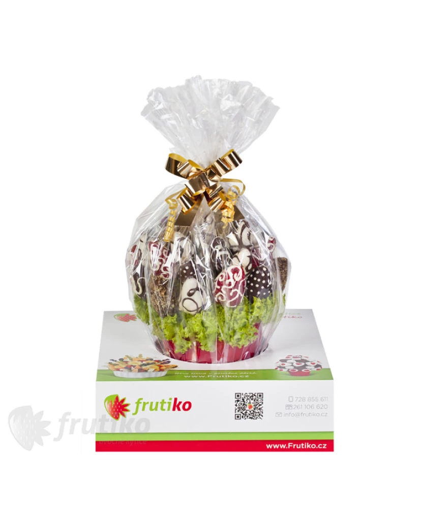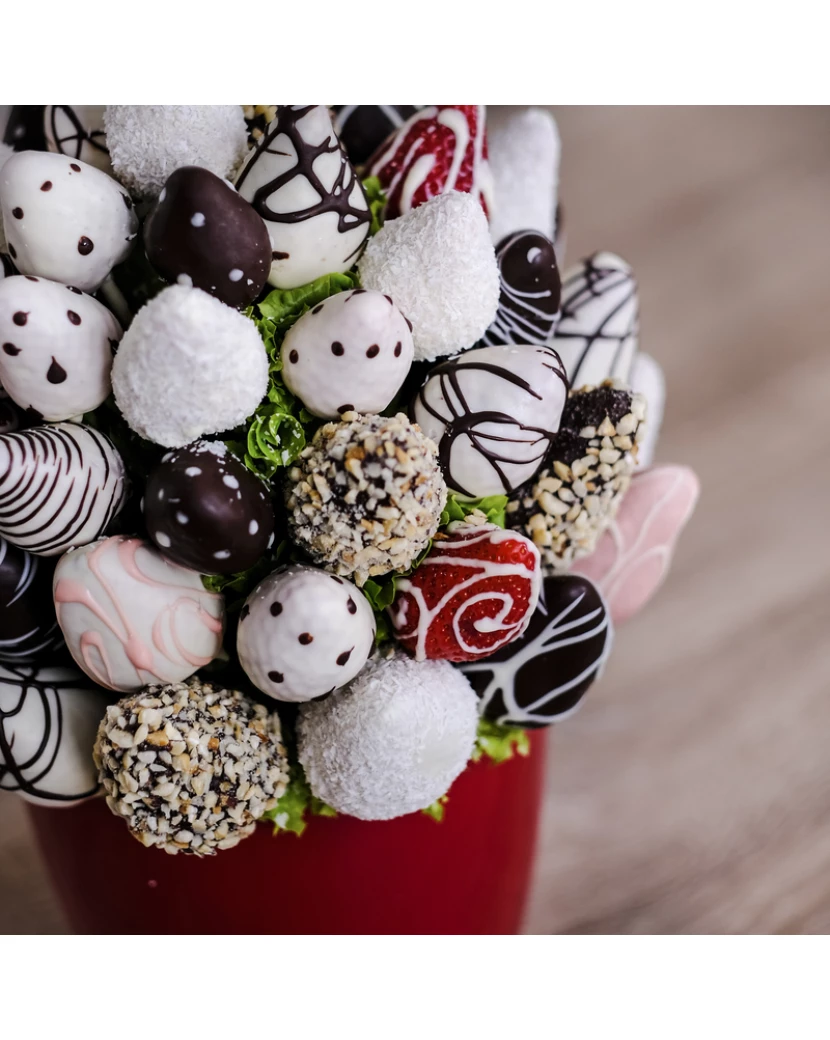 Kytice Jahodová vášeň z čerstvých jahod zdobených bílou a tmavou belgickou čokoládou, kokosem, oříšky a mandlem potěší především ty, kteří milují kombinaci jahod v čokoládě. Ovocné a čokoládové kytice Frutiko jsou vyrobeny z čerstvého pečlivě vybíraného ovoce a pravé belgické čokolády a představují krásný a chutný dárek k výjimečným událostem jako narozeniny, svátek, či výročí. V nabídce Frutiko je k dostání také kytice z jahod pouze v bílé čokoládě Miluji Tě či v mléčné čokoládě kytice Čokoládová fantasie. Užijte si čerstvé jahody a pravou belgickou čokoládu a zažijte sladkou jahodovo-čokoládovou vášeň.