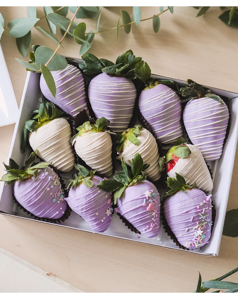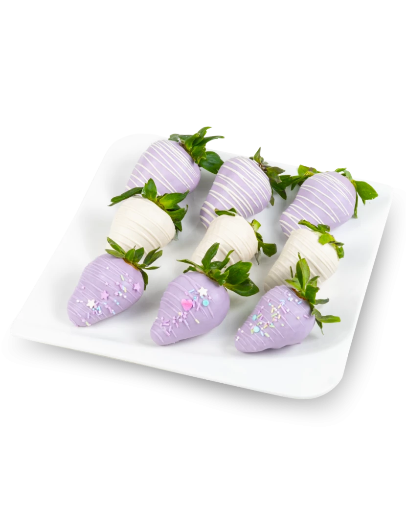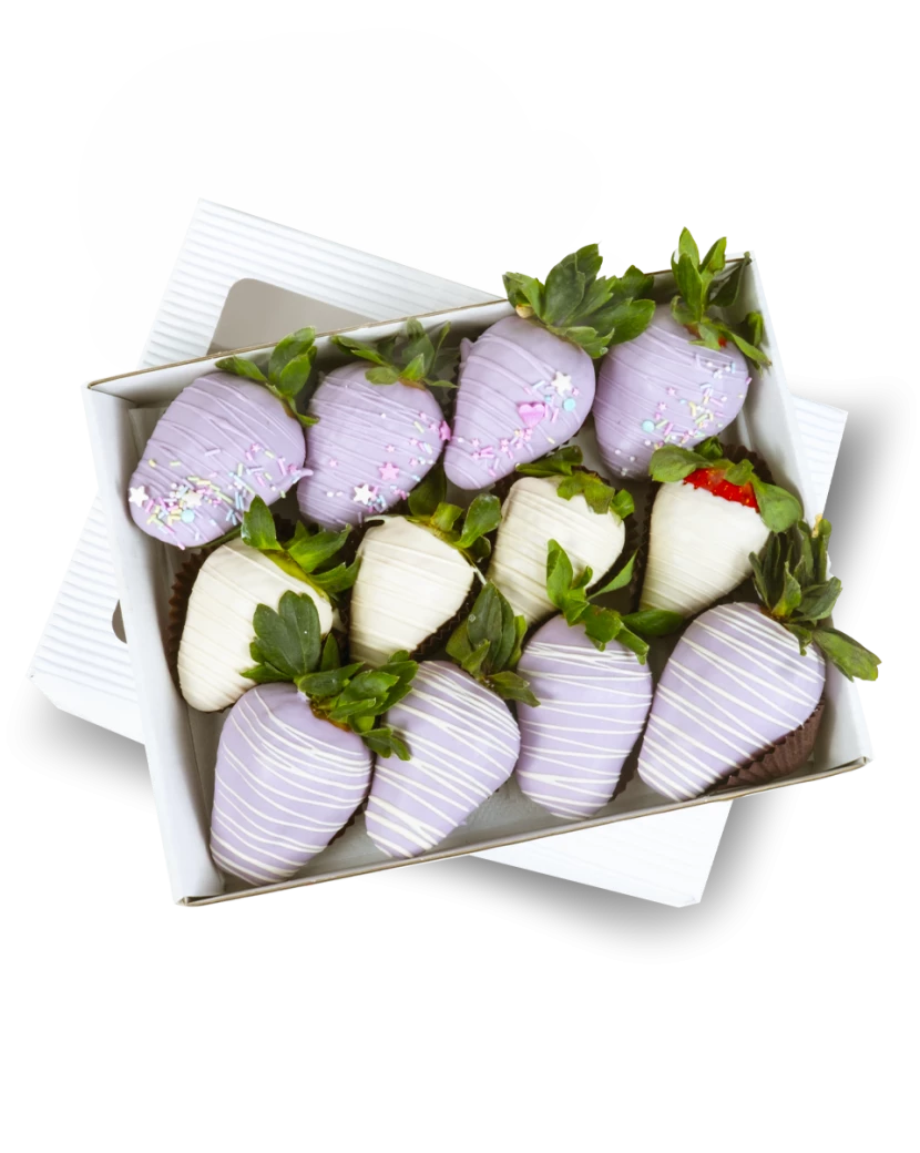 Čerstvé, sladké a šťavnaté jahody máčené v bílé belgické čokoládě, která je z poloviny barvená potravinářskou barvou do moderního odstínu lila. Tato netradiční bonboniéra plná jahod v belgické čokoládě, zdobených cukrovými posypky, potěší jako dárek pro ženy a mladé dívky, skvěle se ale také hodí jako občerstvení na svatební sweetbar či candybar. Rádi vám připravíme jahody v čokoládě v jakékoli jiné barvě či se zdobením dle vašich přání a vše doručíme čerstvé a chlazené kamkoli po celém Česku.