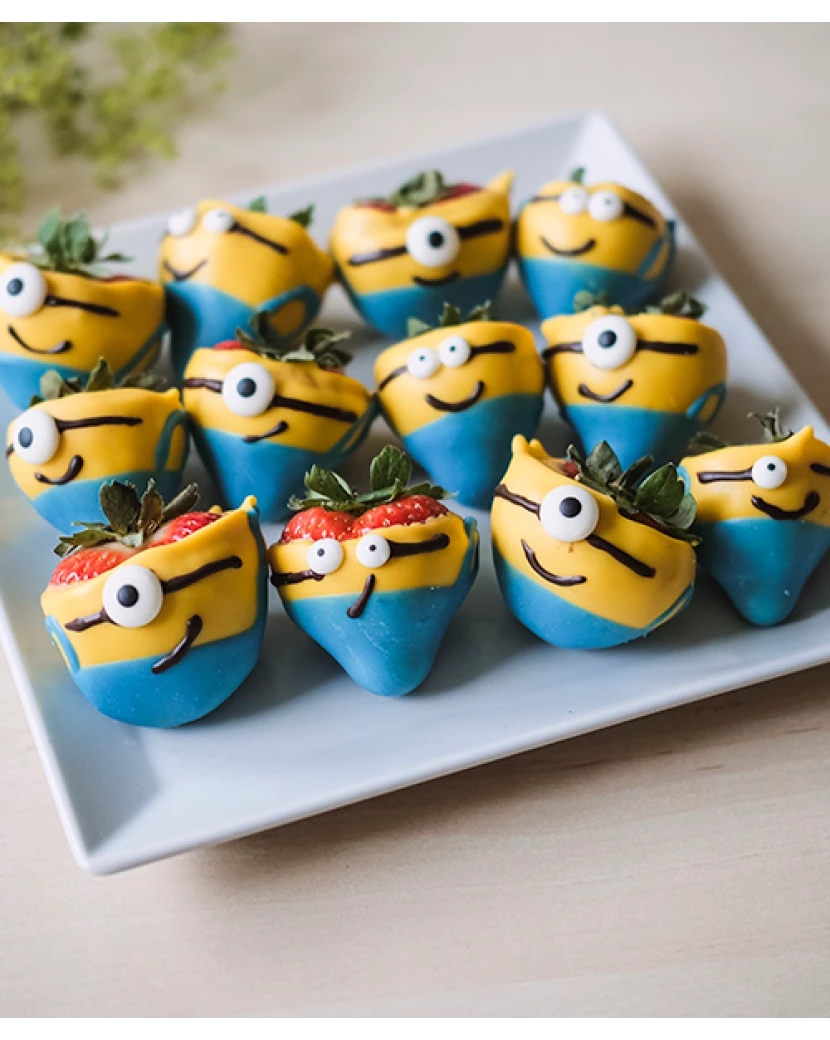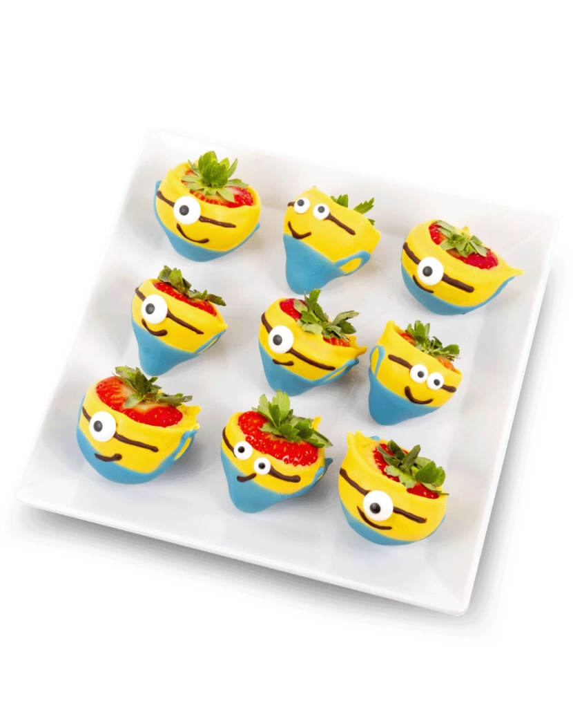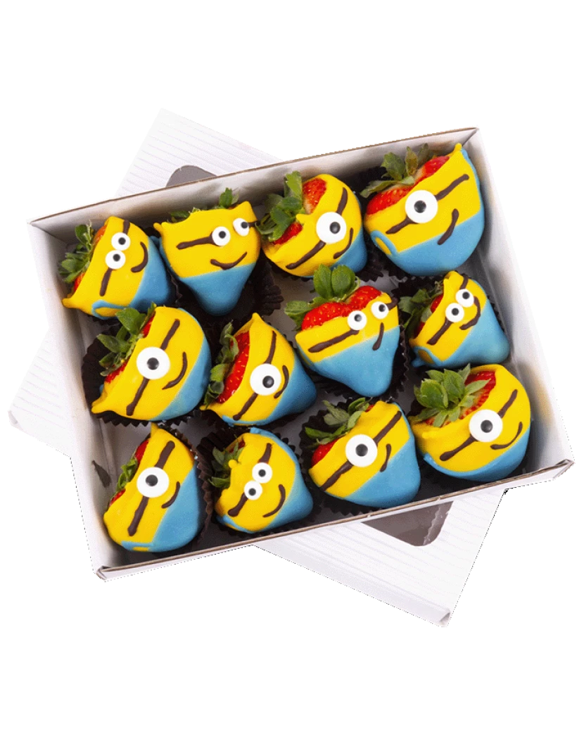 Veselí Mimoni zdobí šťavnaté čerstvé jahody v lahodné čokoládě, pečlivě naaranžované v originální zdravé bonboniéře. Tento hravý a chutný dárek potěší každé dítě – ať už k narozeninám, svátku nebo jen tak pro radost. S láskou připravené a doručené nejen v Praze a Brně, ale po celé ČR, aby vykouzlily úsměv na každé dětské tváři.