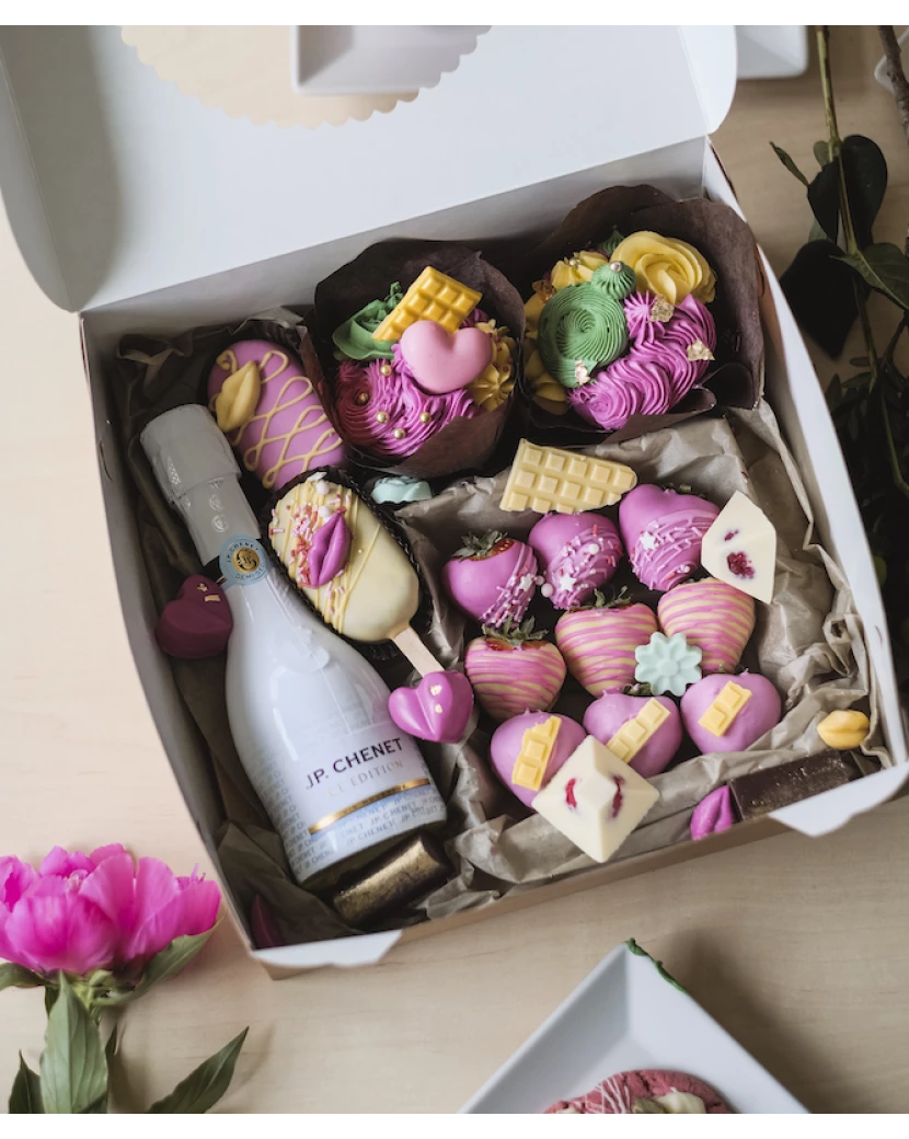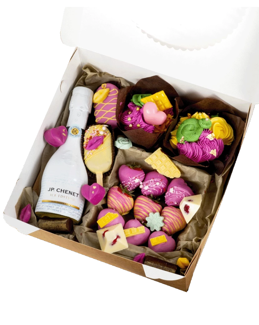 Dárková krabička v jarních barvách - bastelově žluté a magento růžové. Box delikates obsahuje čerstvé jahody v belgické čokoládě, pralinky s čerstvými malinami v bílé čokoládě, dortové nanuky, cupcakes a šumivé víno JP: Chenet. Originální dobroty v žluté a růžové barvě vyrábíme z čerstvého ovoce a kvalitní bílé belgické čokolády, která je obarvená do požadované barvy. Tento netradiční dárkový boxík s pochutinami udělá radost každé ženě, která ráda mlsá. Pro pány vám rádi změníme barvu například na modrou nebo zelenou.