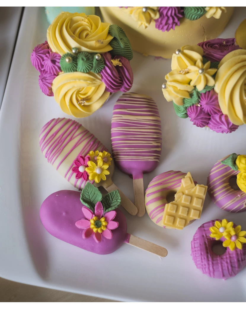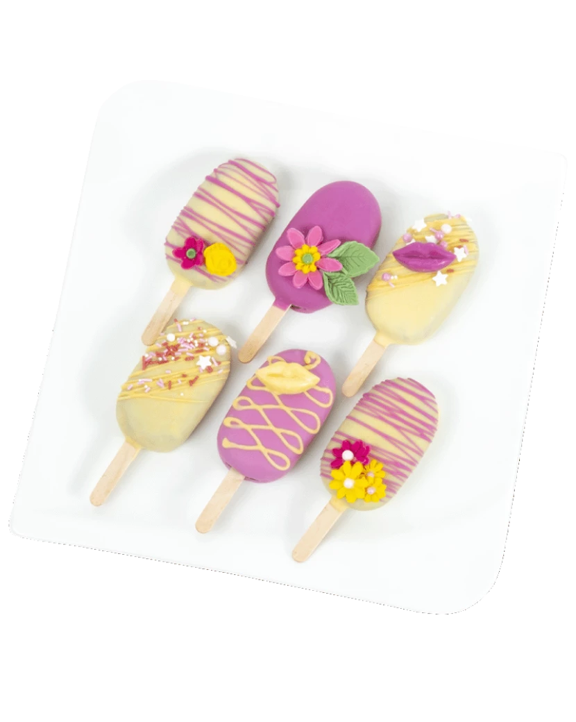Pečené nanuky z dortového těsta jsou inovací v oblasti dezertů. Nejedná se o klasickou zmrzlinu, ale o netradiční zákusek vytvořený z piškotového těsta, které je rozdrobené a smíchané s bohatým krémem z mascarpone a belgické čokolády. Celý tento dezert je obalený a ponořený do lahodné světle žluté a růžové čokolády, a navíc ozdobený čokoládovými dekoracemi, cukrovými perličkami a fondánovými kvítky. Tyto elegantní a originální mini dortíky na špejli jsou perfektním dárkem pro všechny dívky a ženy, které rády mlsají. Pro muže rádi připravíme variantu v jiné barevné kombinaci.