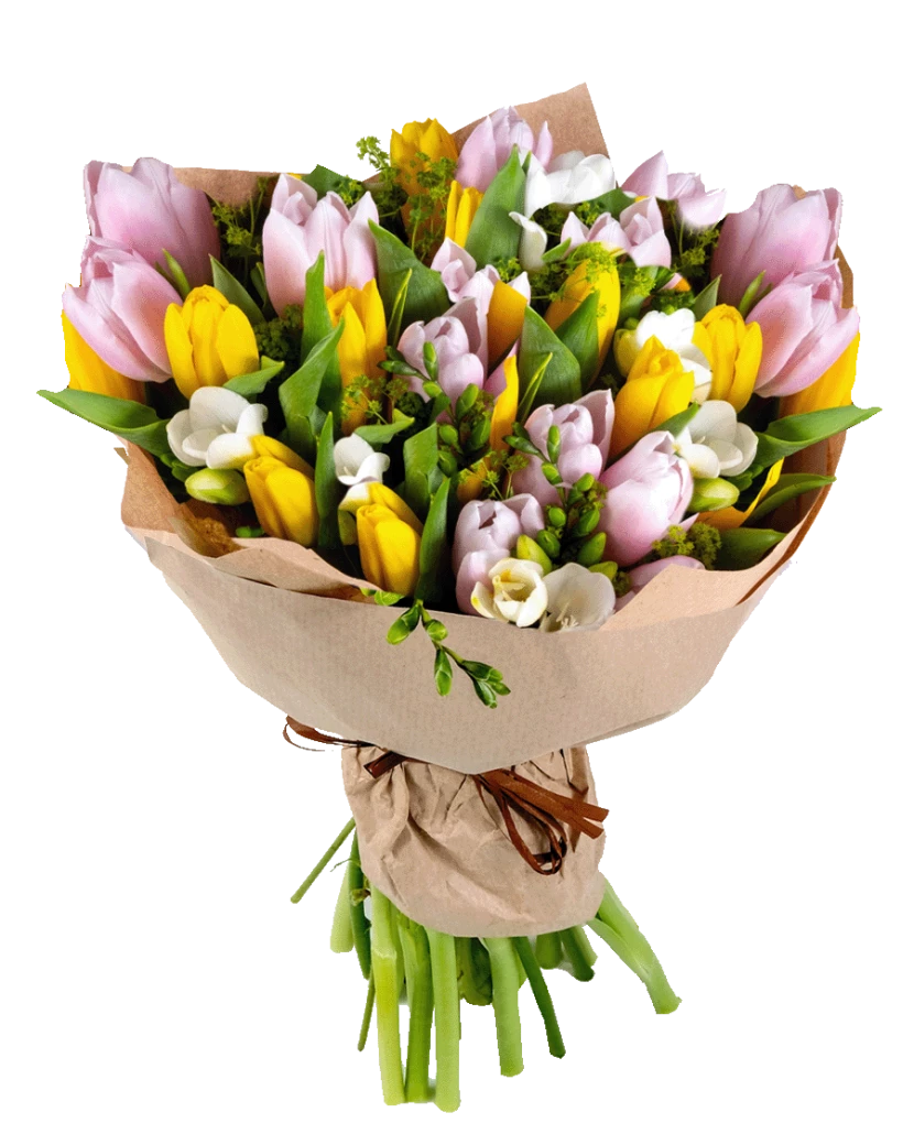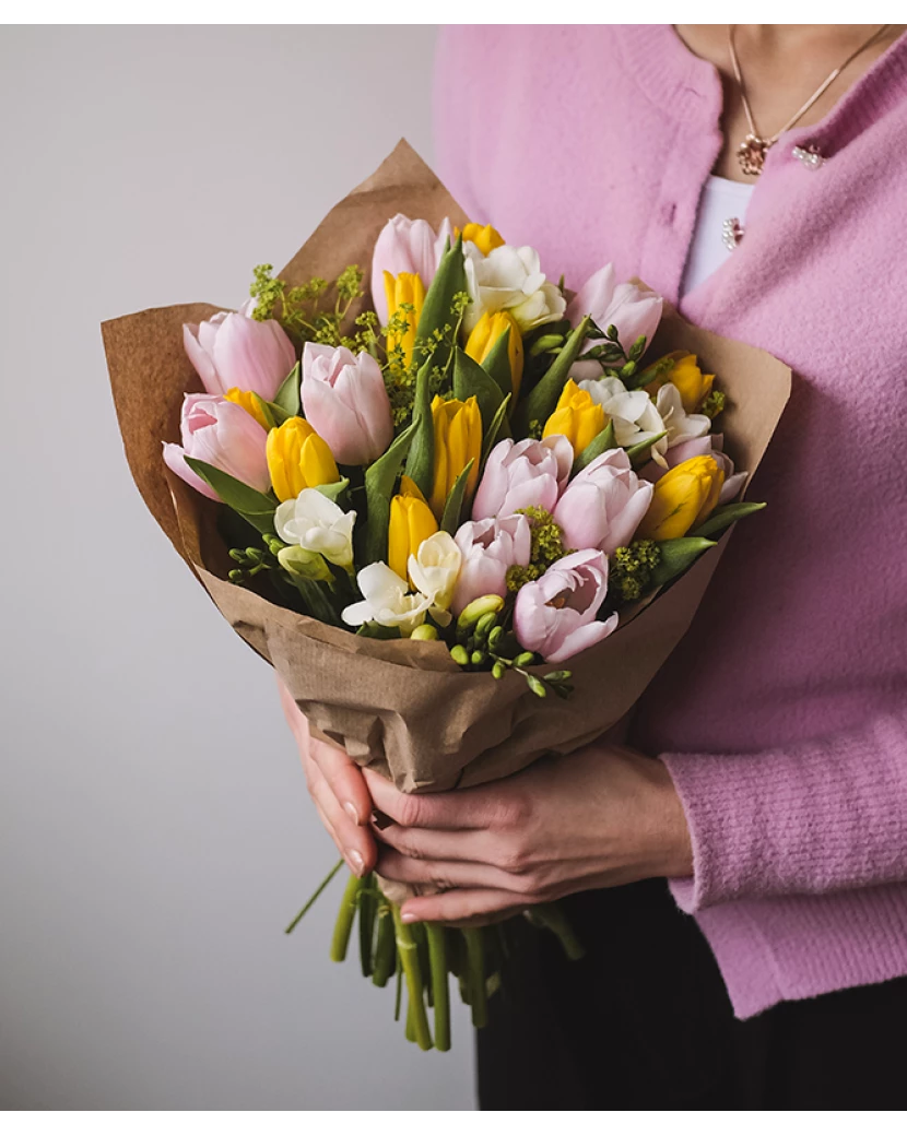 Krásné čerstvé tulipány v růžové a žluté barvě uvázané do bohaté kytice dozdobené dle aktuální skladové nabídky. Tento jemný ženský pugét má jarní náladu a hodí se jako dárek například ke Dni žen nebo jen tak pro radost a rozveselení. Tulipány obecně jsou symbolem jara, lásky a naděje. Žlutá barva květin znamená pozitivní energii, úsměv a radost a růžové tulipány symbolizují něžnou vernou lásku. Kombinaci jarních tulipánů v růžové a žluté barvě jako dárek pro ženu rozhodně nic nezkazíte, ba naopak. Květiny doručujeme vždy čerstvé a chlazené, dárkově balené s mašlí a blahopřáním a to kamkoli po celé České republice.