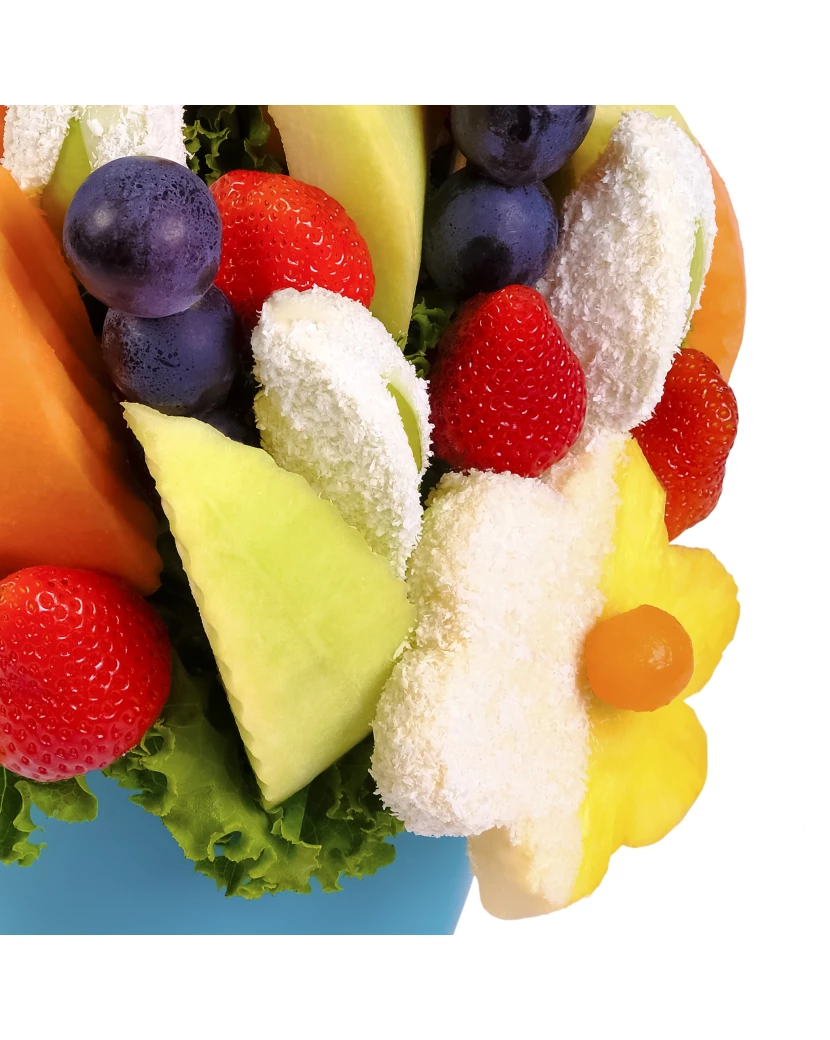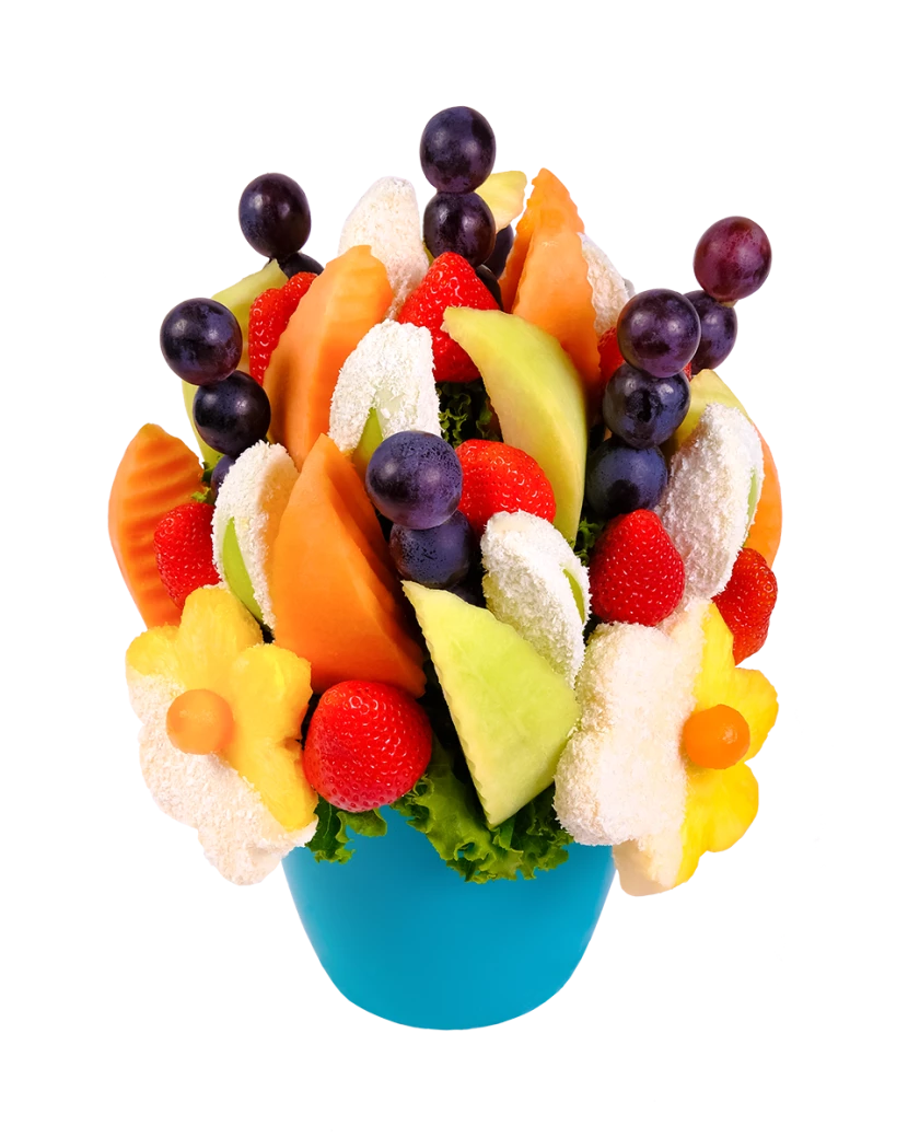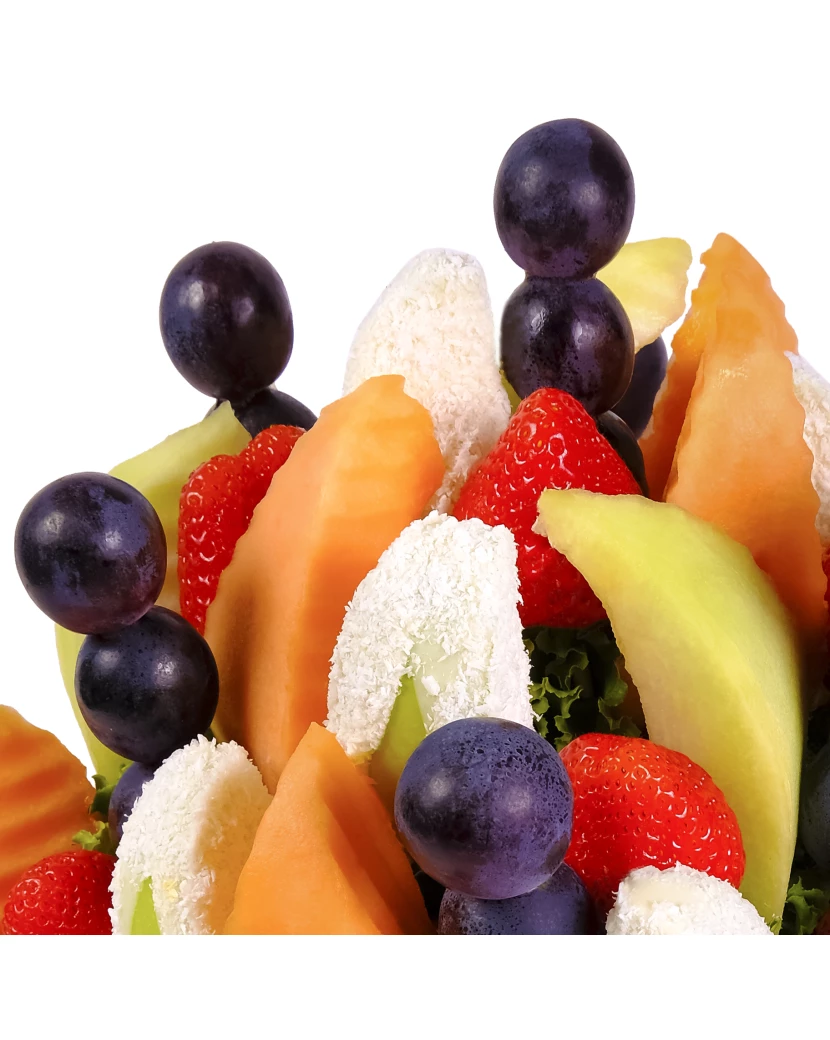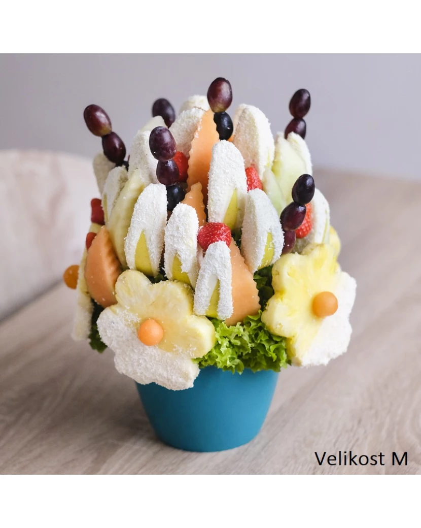 Kokosový sníh je jedlá kytice z čerstvého ovoce, která vypadá velice elegantně a zároveň skvěle chutná. Kytice Kokosový sníh je vytvořená ze šťavnatých kousků ananasu, čerstvých jahod a zelených jablek, namočených do bílé čokolády a kokosu. Tento originální dárek přináší dokonalé spojení bílé čokolády, kokosu a čerstvého ovoce, které omámí Vaše smysly. Spojení kokosu a čokolády se může zdát na první pohled zvláštní, ale kdo jednou okusí, pochopí, že je to dokonalá harmonie! Milovníky bílé čokolády a kokosu osloví například i bonboniéra Jahody v čokoládě mix.