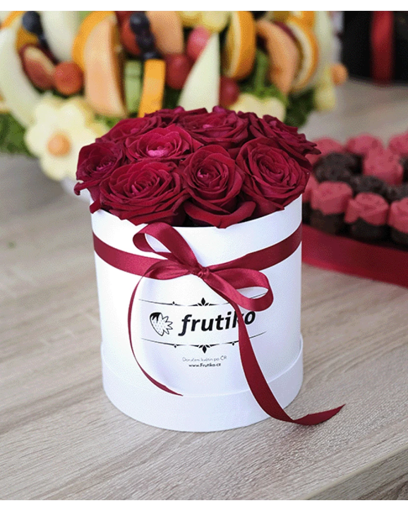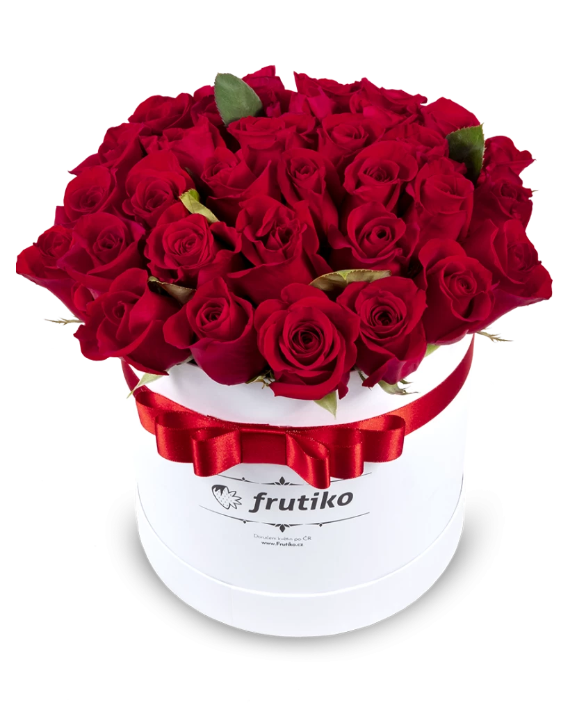 Frutiko dodává bílé krabice rudých růží ve několika velikostních variantách.