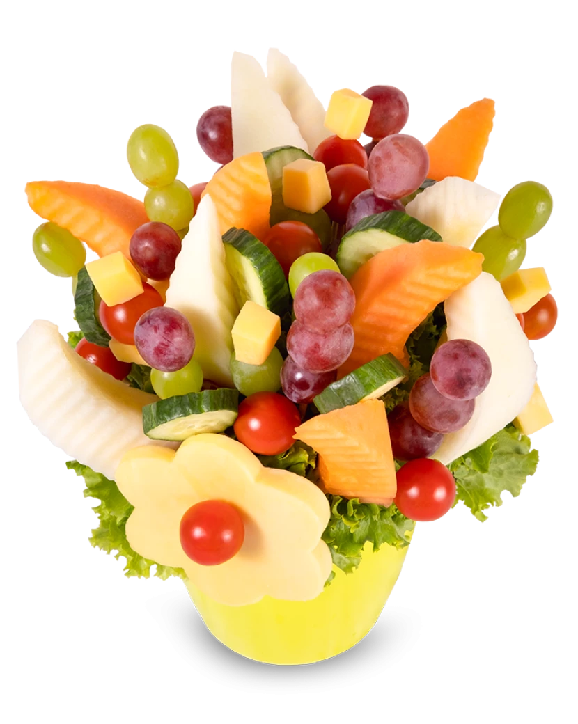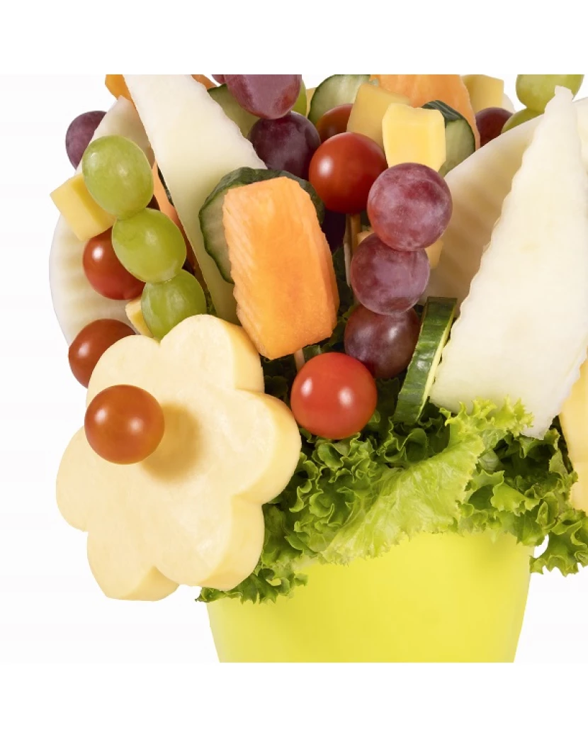 Hledáte netradiční dárek pro ženu, muže, ať už k výročí, narozeninám nebo svátku? Připravili jsme ojedinělou ovocnou a zeleninovou kytici se sýrem, která je vynikající doplnění k vínu. Pokud jste milovníky dobrého vína a jídla, vyzkoušejte naši novinku. Kytice z ovoce, zeleniny a sýra může být originální dárek nebo občerstvení pro romantický večer ve dvou. Kytice obsahuje sýr, cherry rajčata, okurku, hroznové víno a meloun. Je to dokonalé skloubení chutí k popijení vína. Navíc je kytice z ovoce, zeleniny a sýra krásný dárek ke Dni otců. Ovoce a zelenina je do kytice pečlivě vybíráno a ihned po výrobení odesláno k vám.