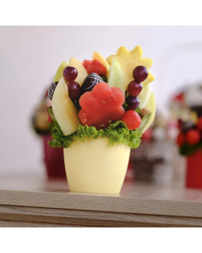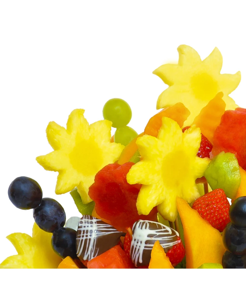 Lahodná Letní kytice plná čerstvého sezónního ovoce jako vodní meloun, jahody, ananasová sluníčka, exotické melouny, hrozny a kiwi představuje osvěžující letní občerstvení na venkovní oslavy či zahradní slavnosti. Touto krásnou šťavnatou kyticí potěšíte v létě každého, ať už jen tak pro radost, či jako dárek k narozeninám či svátku. Ananasy ve tvaru sluníček a vodní meloun ve tvaru kytiček rozzáří Váš den.