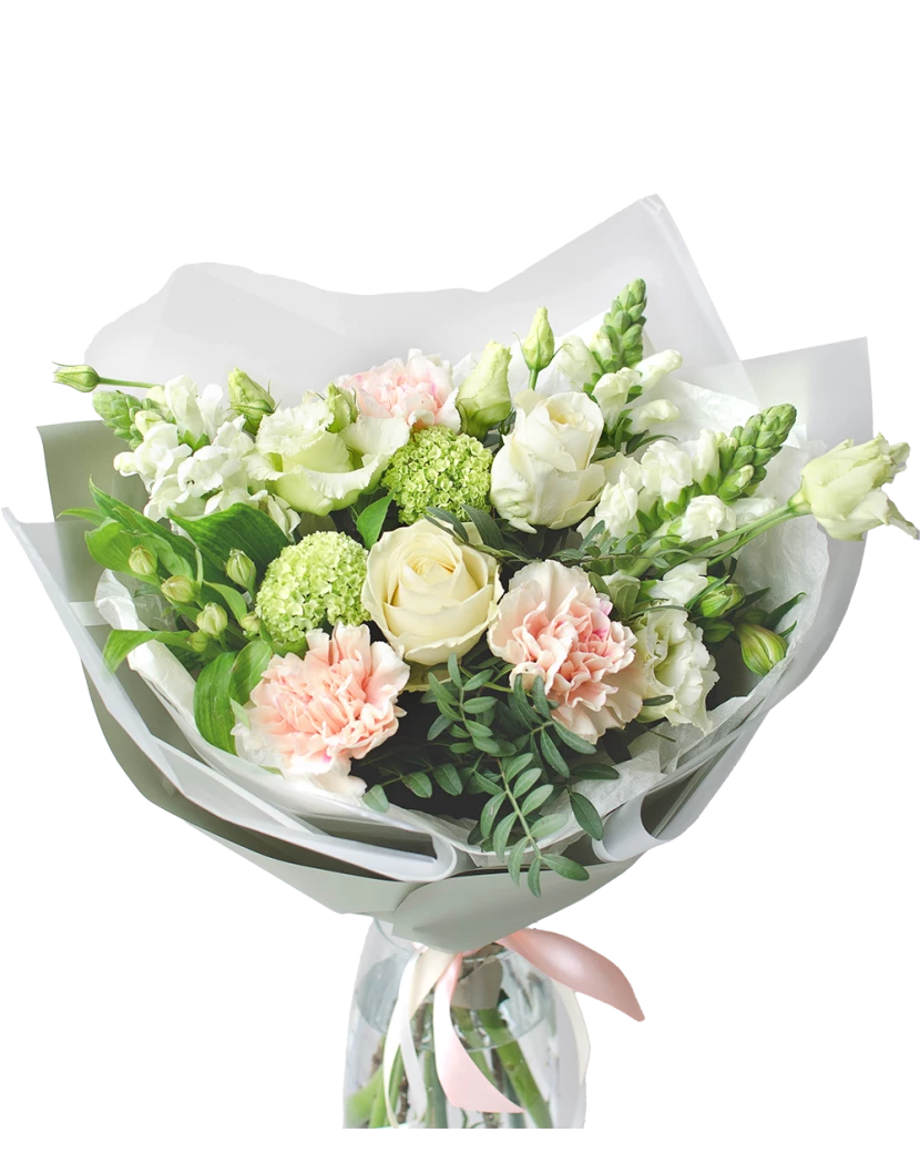 Složení: Růže, Alstromerie, Pistácie (Řečík Lentišek), Eustoma, Karafiáty, Matthiola