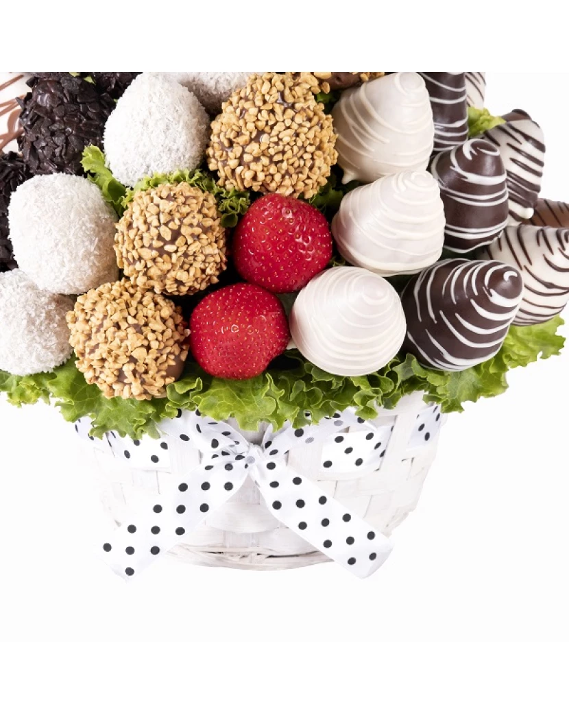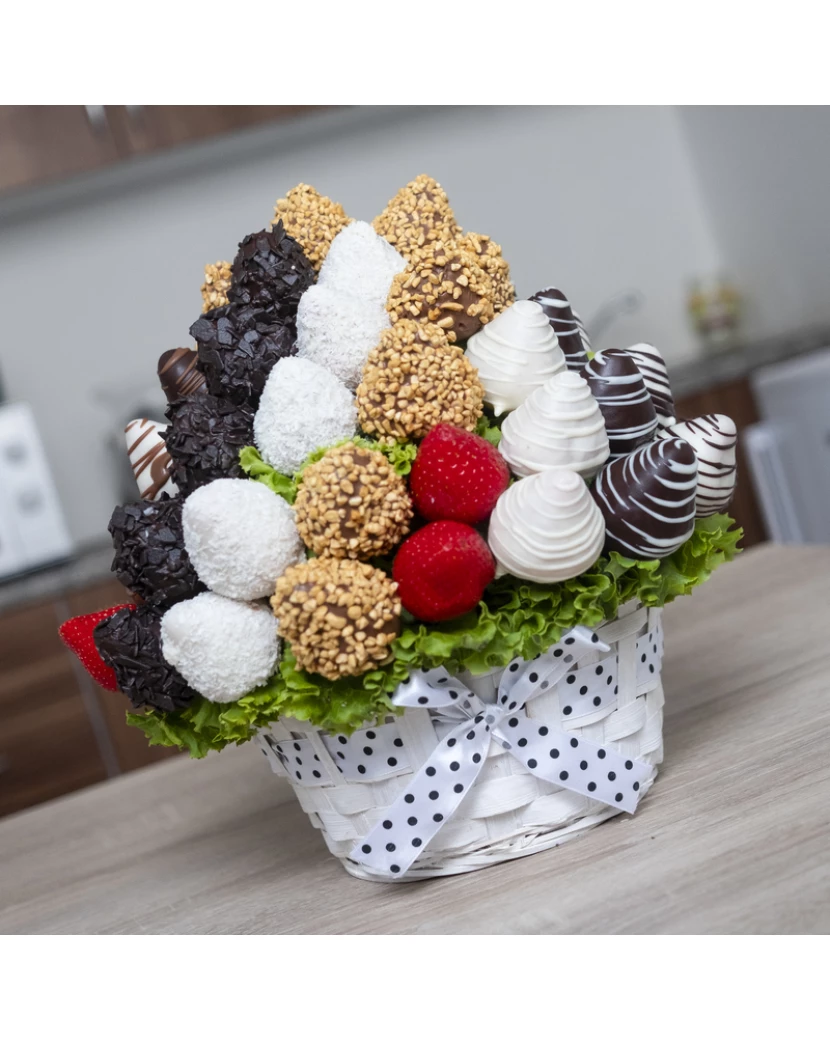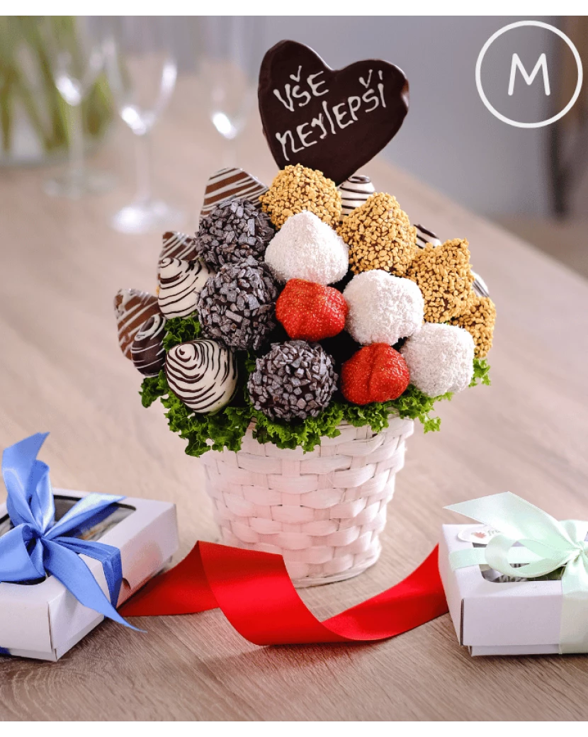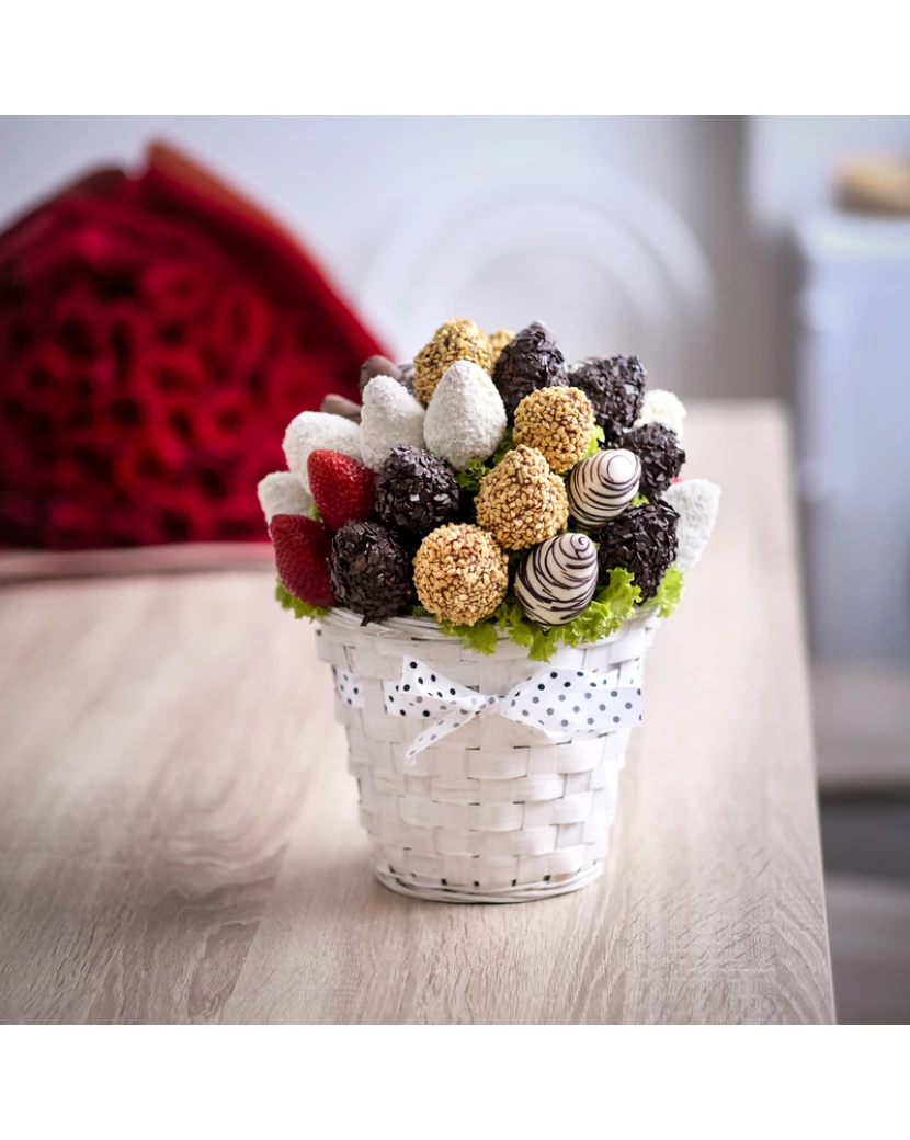 Tato kytice vytvořená z čerstvých šťavnatých jahod namočených do belgické čokolády - bílé, mléčné i tmavé polosladké má velmi luxusní vzhled. Jahody v čokoládě jsou naaranžované do bílého proutěného koše a na vršku jsou zdobené nejen belgickou čokoládou značky Callebaut, ale také kokosem, karamelovou rýží a čokokousky. Jedlé kytice z ovoce a čokolády doručujeme po celé ČR chlazené, dárkově balené s blahopřáním s Vaším osobním textem pro příjemce dárku. Alternativou ovocných kytic jsou luxusní ovocné bonboniéry. Obojí potěší jako luxusní dárek pro ženy i muže každého věku a postavení.