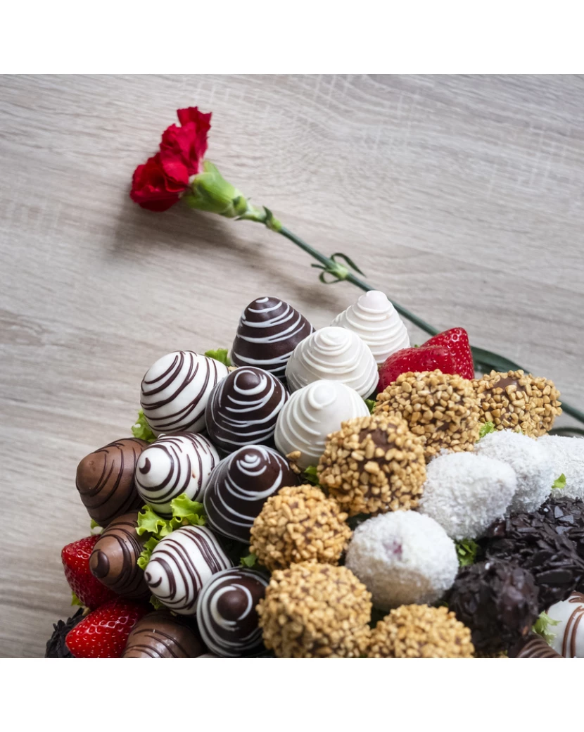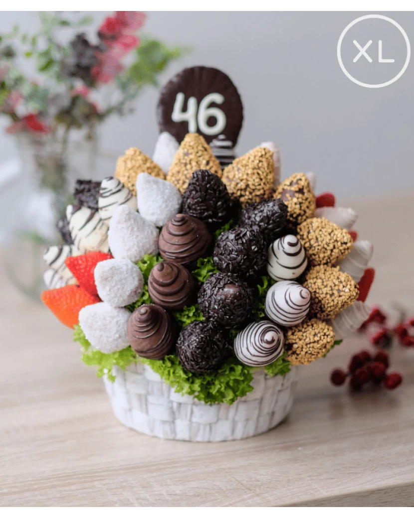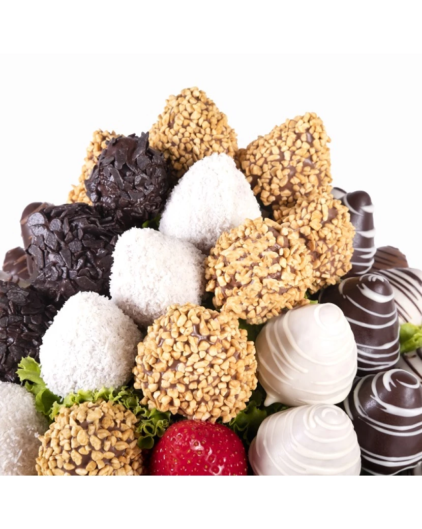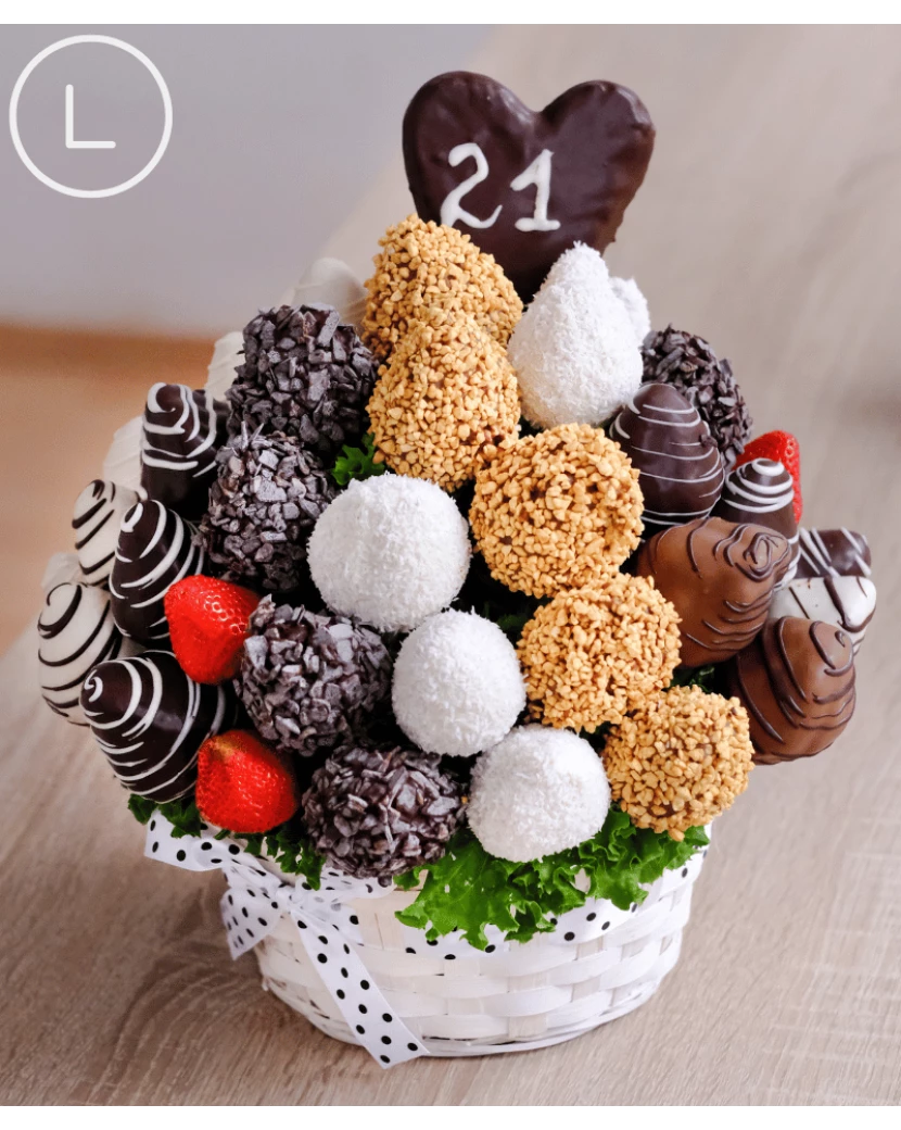 Tato kytice vytvořená z čerstvých šťavnatých jahod namočených do belgické čokolády - bílé, mléčné i tmavé polosladké má velmi luxusní vzhled. Jahody v čokoládě jsou naaranžované do bílého proutěného koše a na vršku jsou zdobené nejen belgickou čokoládou značky Callebaut, ale také kokosem, karamelovou rýží a čokokousky. Jedlé kytice z ovoce a čokolády doručujeme po celé ČR chlazené, dárkově balené s blahopřáním s Vaším osobním textem pro příjemce dárku. Alternativou ovocných kytic jsou luxusní ovocné bonboniéry. Obojí potěší jako luxusní dárek pro ženy i muže každého věku a postavení.