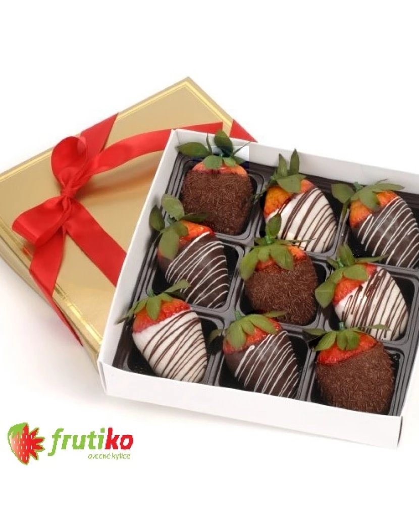Malá ovocná bonboniéra obsahuje 9 kousků jahod v čokoládě zabalených v luxusní krabičce s mašlí. Přidejte tuto bonboniéru k Vaší objednávce a potěšte své blízké lahodnými jahůdkami v kvalitní čokoládě se zdobením. Pokud máte rádi kombinaci jahod v čokoládě, vyzkoušejte také ovocnou kytici Čokoládové jahody naaranžovanou z lahodných jahůdek v tmavé belgické čokoládě. Všechny ovocné kytice můžete také doplnit 8 kousky jahod v čokoládě či banánů v čokoládě.