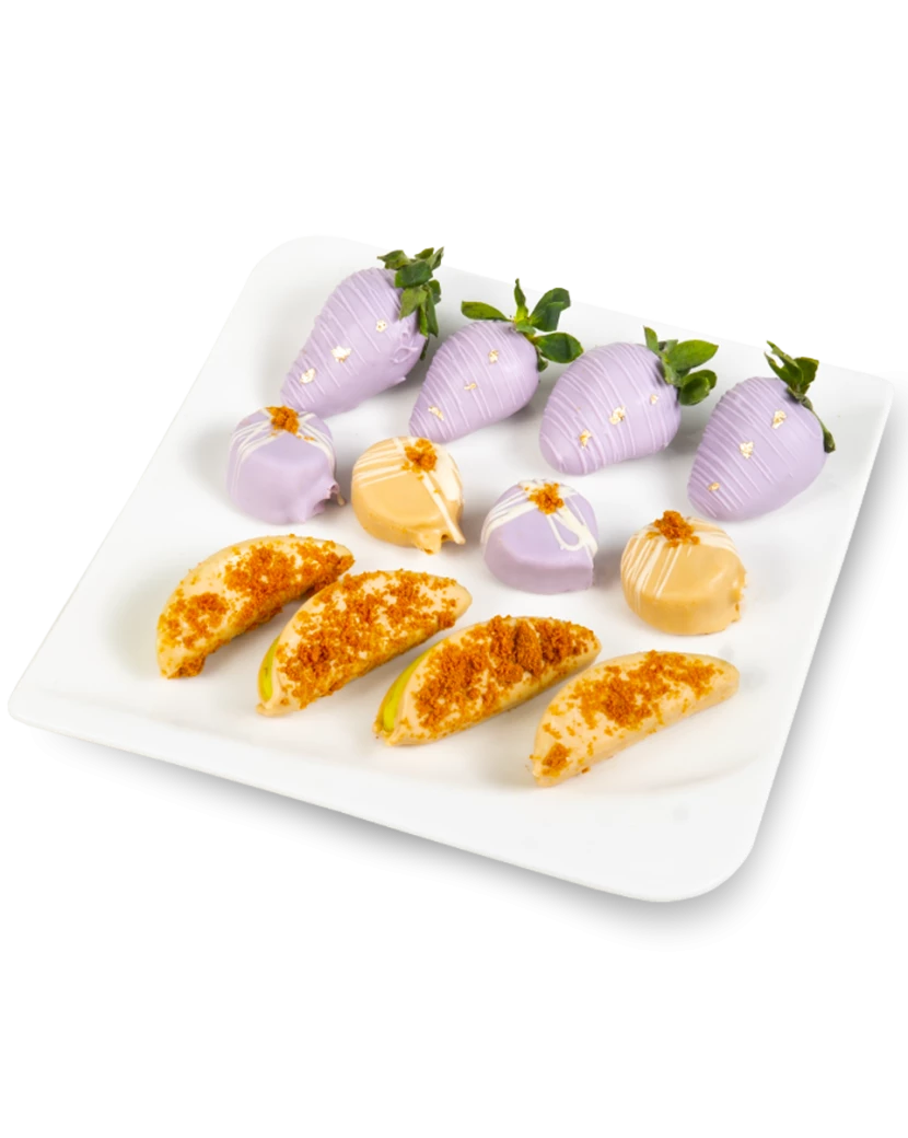 Čerstvé jahody, banány a jablka Granny Smith namočené v bílé - potravinářskou barvou lila barvené čokoládě a karamelové zlaté čokoládě. Zdobené jsou dále rozdrcenými LOTUS sušenkami a zlatými šupinkami. Ovocné bonboniéry obsahující kousky čerstvého ovoce v belgické čokoládě jsou oblíbeným a netradičním dárkem k jakékoli události. Barvu čokolády a zdobení bonboniéry si můžete vybrat a my připravíme originální bonboniéru v barvách a designu dle vašich přání. Doručujeme čerstvé a chlazené, dárkově balené s blahopřáním kamkoli po ČR.