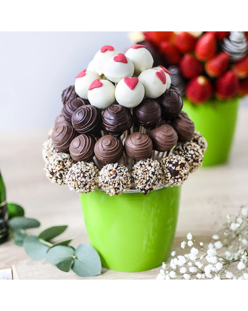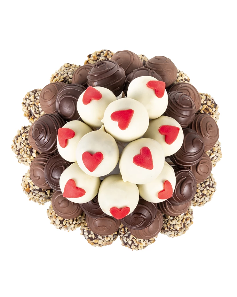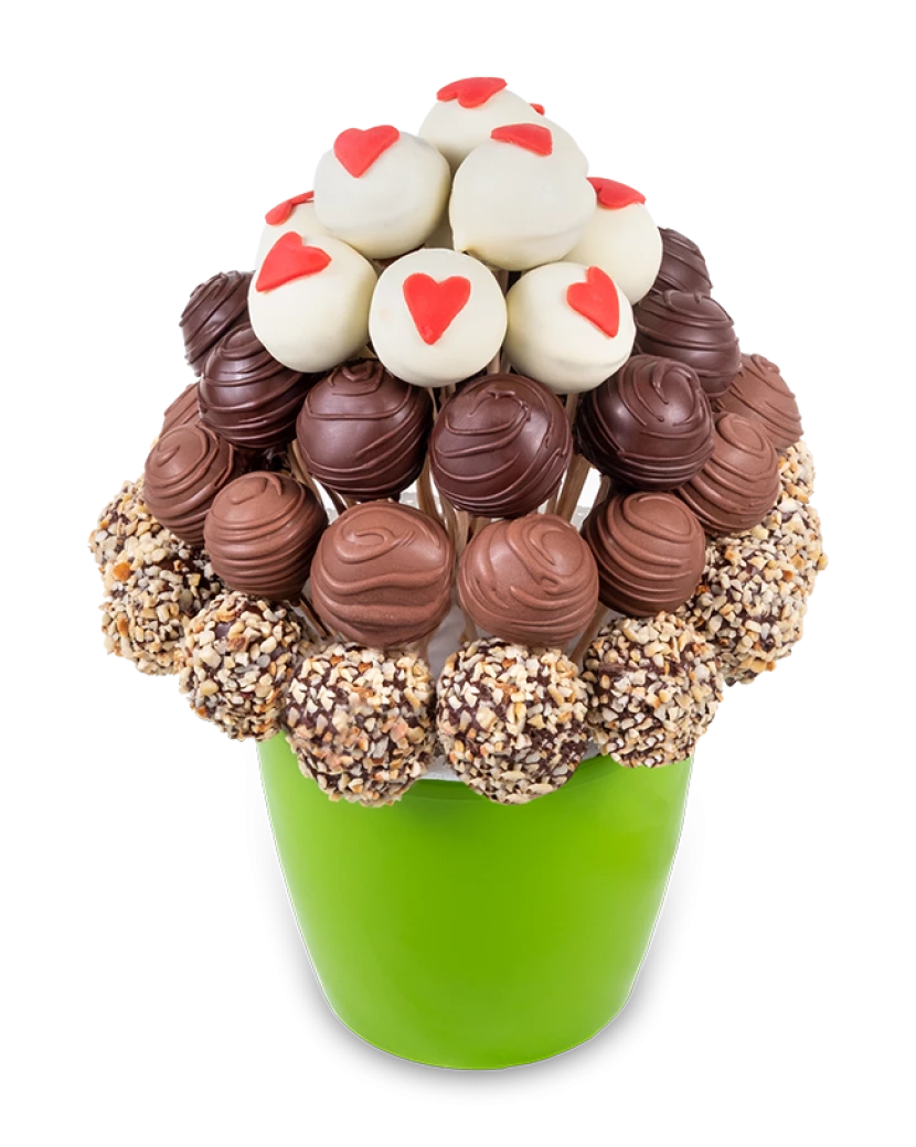 Dortové kytice jsou vyráběné z kakaových popcakes neboli kuliček z piškotového těsta na špejli namočených v belgické čokoládě. V této kytici jsou kuličky ještě zdobené lískovými oříšky, pistáciemi a srdíčky z červené fondánové hmoty.