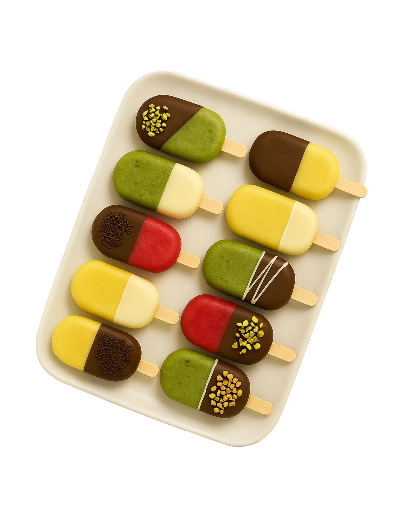 Tyto ovocné nanuky jsou tím pravým letním osvěžením do horkých dnů. Čerstvé zmražené ovoce, ozdobené variacemi bílé, mléčné a tmavé belgické čokolády a různými druhy oříšků, zachutná i náročným mlsným jazýčkům. Nanuky jsou vyrobené z mixu ovoce - jahody, ananas, kiwi, melouny či další druhy ovoce. Nanuky nejsou slazené, neobsahují cukr ani lepek. Belgická čokoláda samozřejmě cukr i laktózu obsahuje, na přání vám uděláme ovocné nanuky bez čokolády jen z čistého čerstvého mixovaného ovoce. Doručujeme chlazené po Praze a Středočeském kraji.