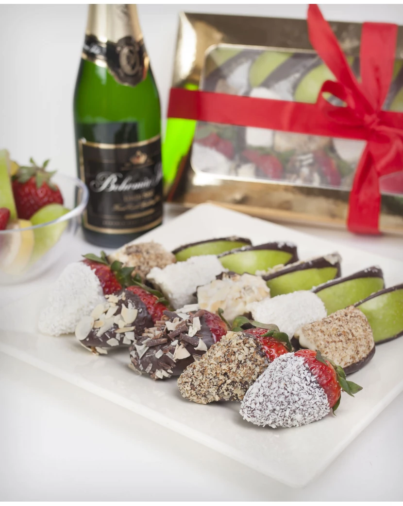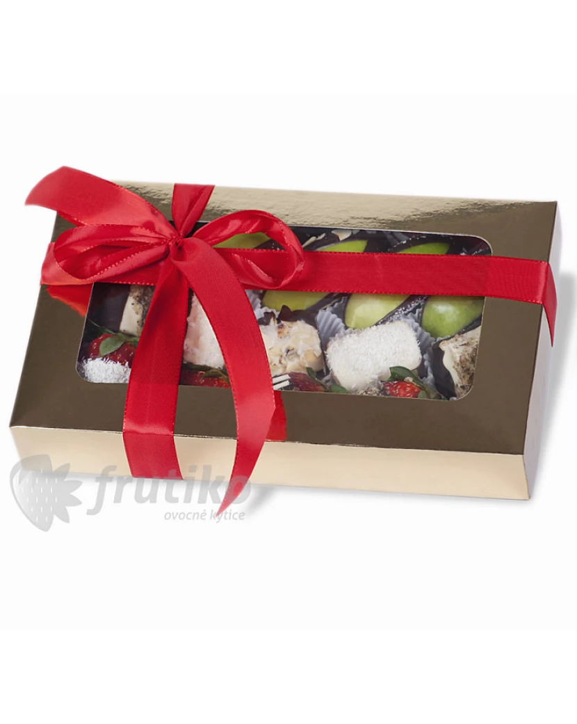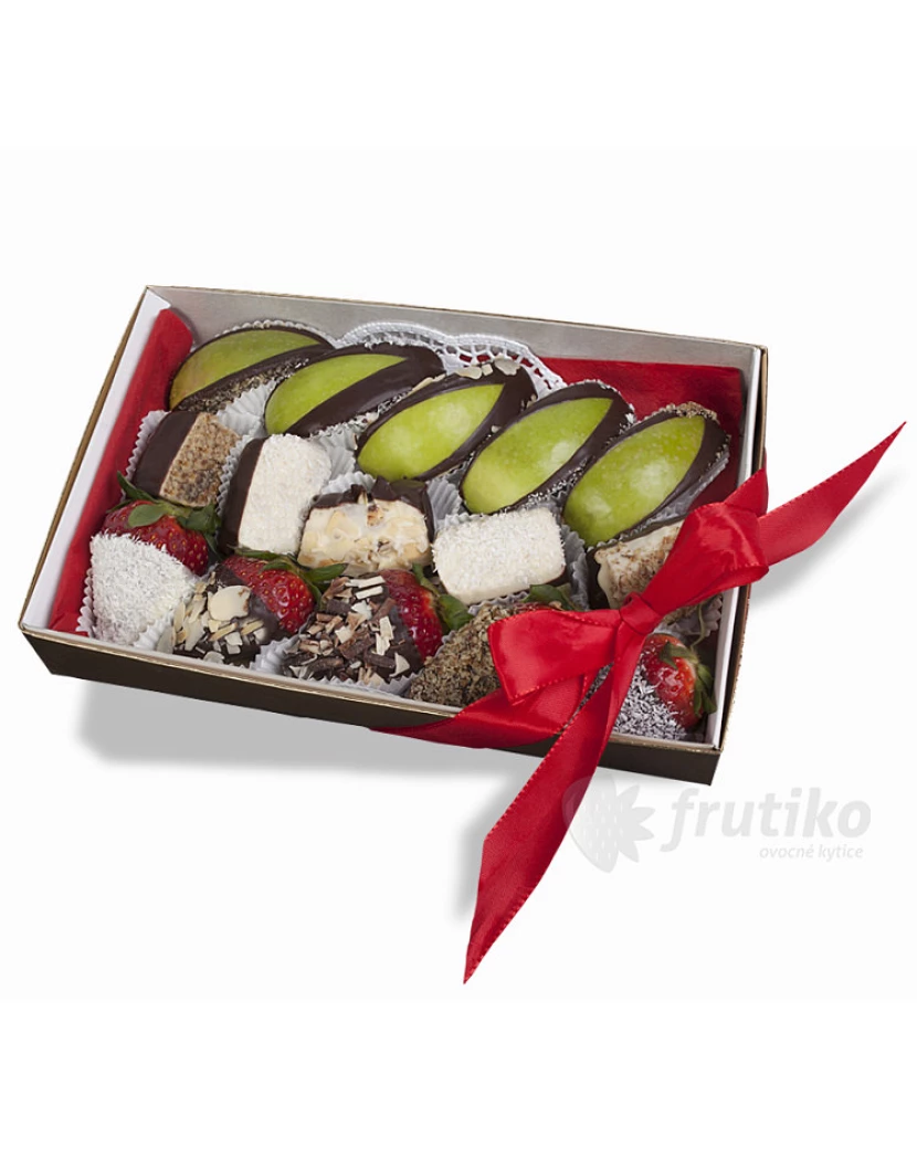 Bonboniéra Ovocná pochoutka z čerstvých jahod, jablek a banánů zdobených bílou a tmavou belgickou čokoládou a oříšky, mandlemi a kokosem předčí klasické čokoládové dezerty. Ovocné bonboniéry Frutiko jsou oblíbenou ovocnou pochoutkou a zároveň chutným poděkováním či dárkem jen tak pro štěstí. Frutiko navíc dbá na kvalitu ingrediencí, vybírá ty nejlepší jahody, šťavnatá jablíčka Granny Smith a banány Chiquita. Kombinace ovoce a belgické čokolády je neodolatelná. Standardní bonboniéra obsahuje 15 kousků ovoce v čokoládě, velká 20 kousků.