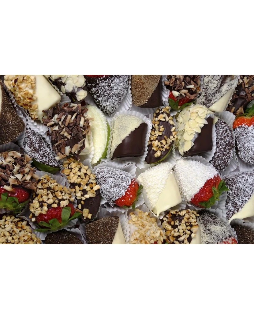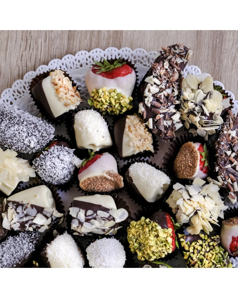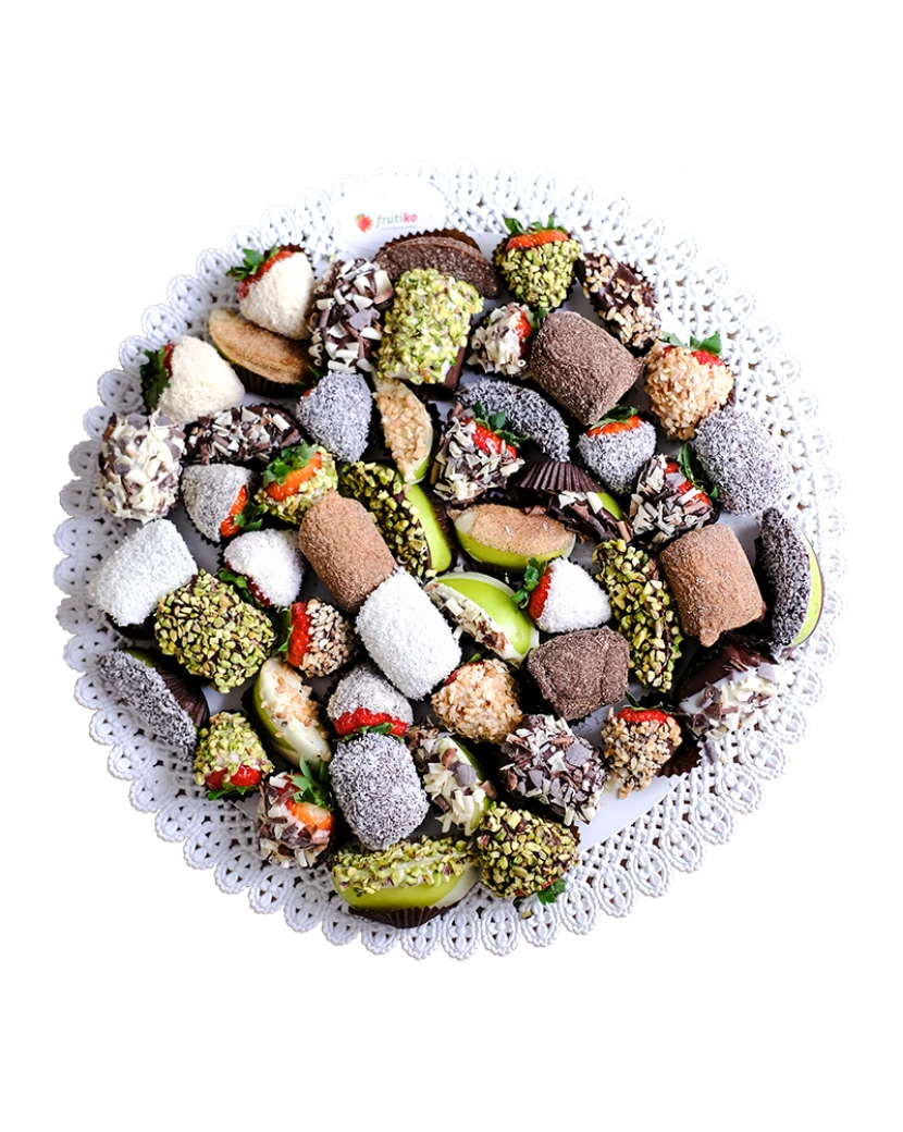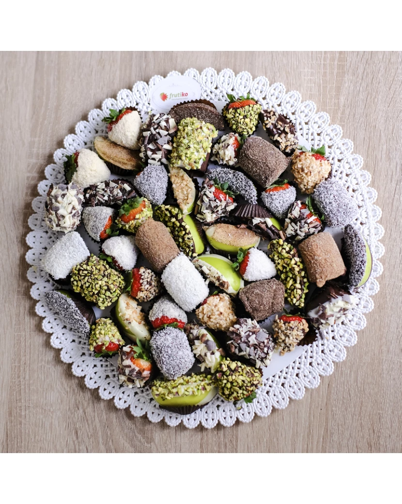 Splněný sen všech mlsných jazýčků. Tác plný lahodných jahod, banánů a jablek, které jsou namáčeny v tmavé a bílé čokoládě. A aby toho nebylo málo, ovoce v čokoládě je posypáno oříšky, mandlemi, kokosem nebo čokoládovými kousky. Ovocný tác je ideální občerstvení na různé oslavy nebo pracovní meetingy. Zkombinujte zdravé ovocné mlsání s pravou belgickou čokoládou a variacemi posypků.