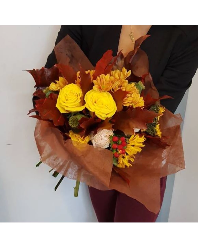Oblíbené podzimní květiny - chryzantémy, slunečnice, dubové listí, makovice, hypericum a růže v krásné podzimní kytici. Tato barevná bohatá kytice hraje teplými barvami - oranžová, žlutá, krémová a hnědá barva vyzařuje teplou příjemnou energii a sílu. Žluté a oranžové květiny celkově symbolizují štěstí, radost a pozitivní energii, jsou proto vhodné jako dárek pro jakoukoli příležitost, například brzké uzdravení nebo pro povzbuzení a dobrou náladu.
