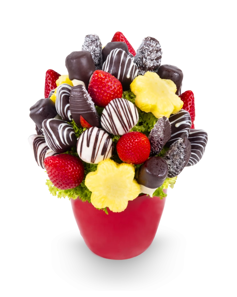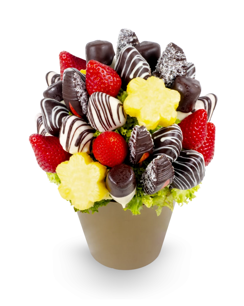 Dárek Pro Tebe v podobě krásné květiny z ovoce a čokolády je vhodný jako překvapení pro ženy i dívky k narozeninám, svátku, výročí a dalším významným událostem. Moment překvapení a radosti při předání kytice kurýrem bude pro Vaši drahou polovičku jistě nezapomenutelná chvilka. Pro tebe je ovocná kytice složená z čerstvých jahod, jablek, ananasu a sladkých banánů obalených v lahodné tmavé a bílé čokoládě zdobené kokosem. Ukrývá v sobě dokonalé spojení ovoce a čokolády v jedlé kytici z čerstvého ovoce, podobně jako Čokoládová fantazie. Zamilovaní mohou vyzkoušet také dárek Z lásky.