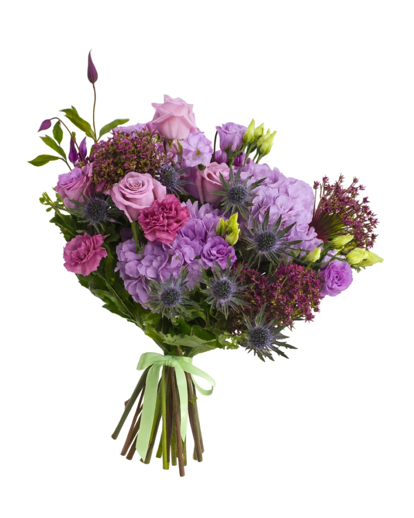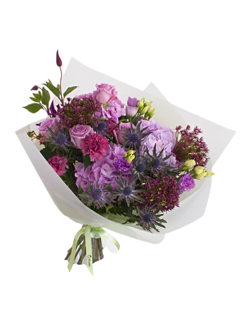 Kytice Martina je elegantní fialová míchaná kytice, ve které se snoubí růže, eustomy, hortenzie, karafiáty a originální bodláky. Bohatá kombinace květů v královsky fialových tónech působí luxusně, tajemně a zároveň velmi elegantně. Ideální volba pro výjimečné příležitosti i jako dárek, kterým chcete vyjádřit obdiv a jedinečnost.