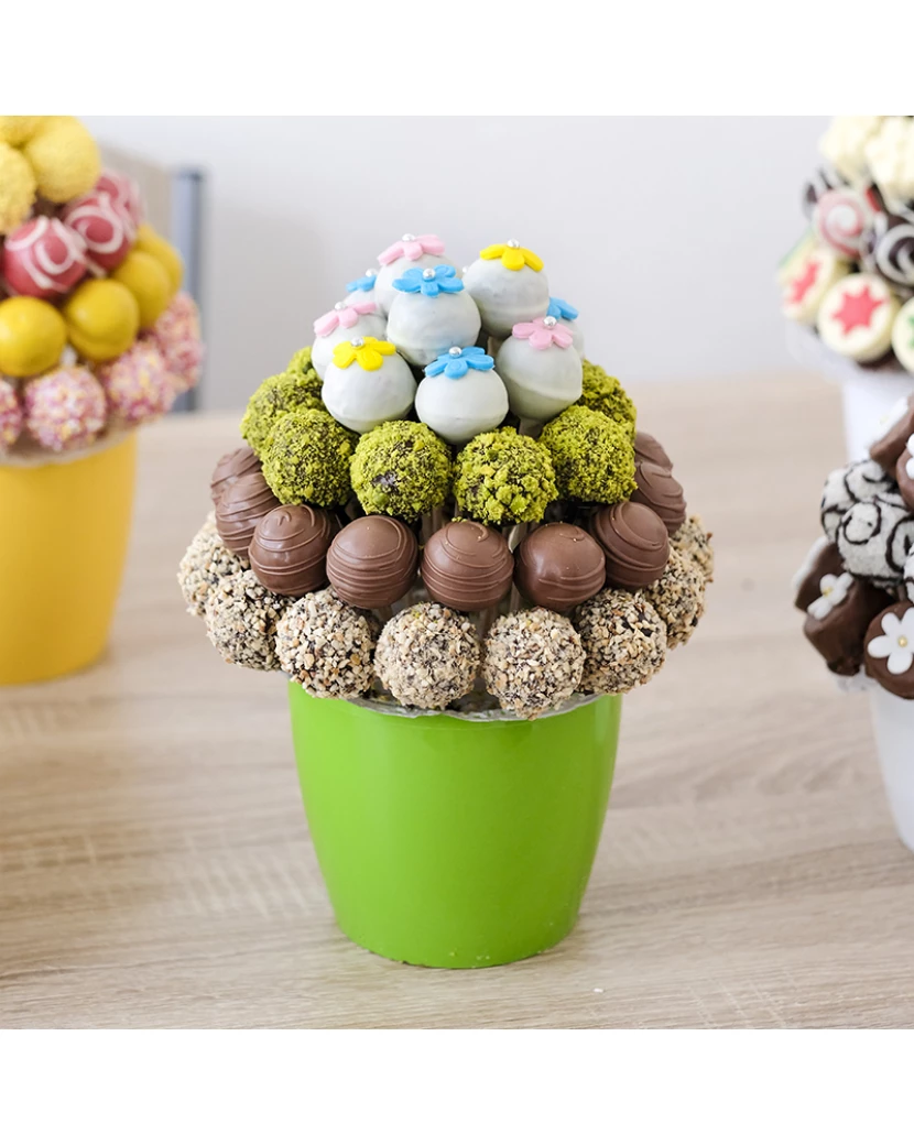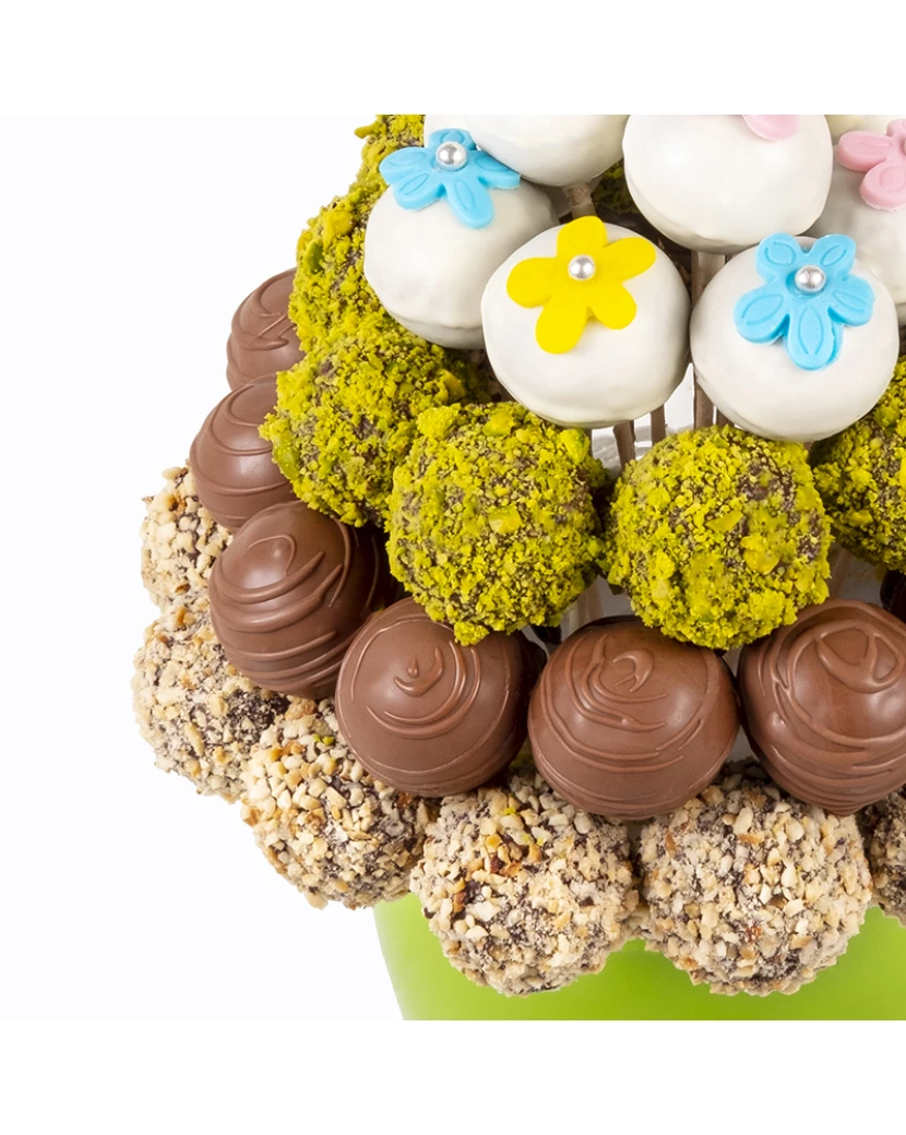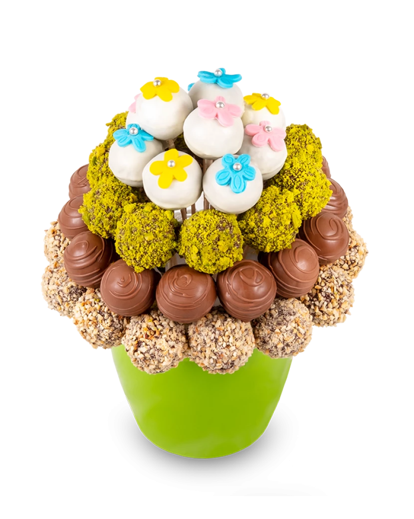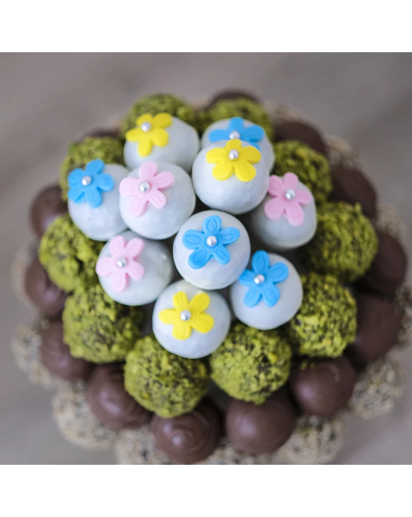 Dortová kytice Rozkvetlá louka je naaranžovaný z kakaových popcakes namočených v belgické čokoládě, ozdobený oříšky, pistáciemi a květinami z fondánu. Fondánové květiny a kytičky na dortu působí velmi jemným romantickým dojmem. Hodí se tedy pro holčičku, ale díky zelenému květináči i pro kluka.