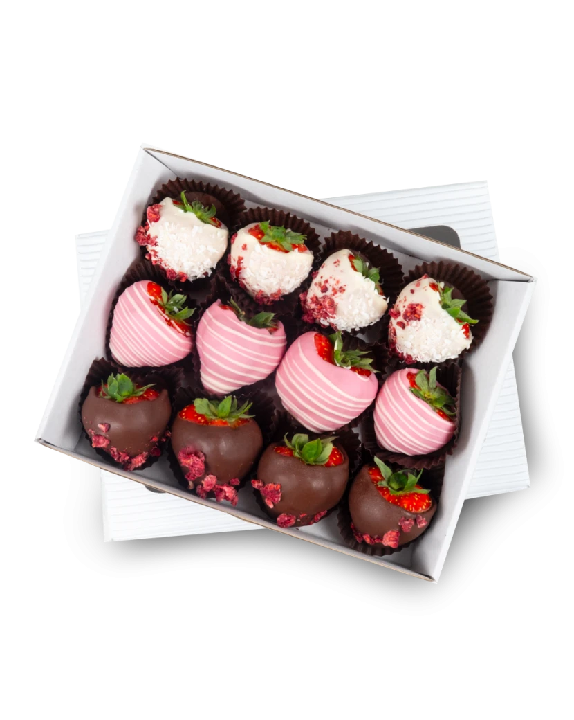 Složení: Jahody, Čokoláda, Bílá čokoláda, Tmavá čokoláda, Čokoláda jahodová, Sušené ovoce, Kokos
