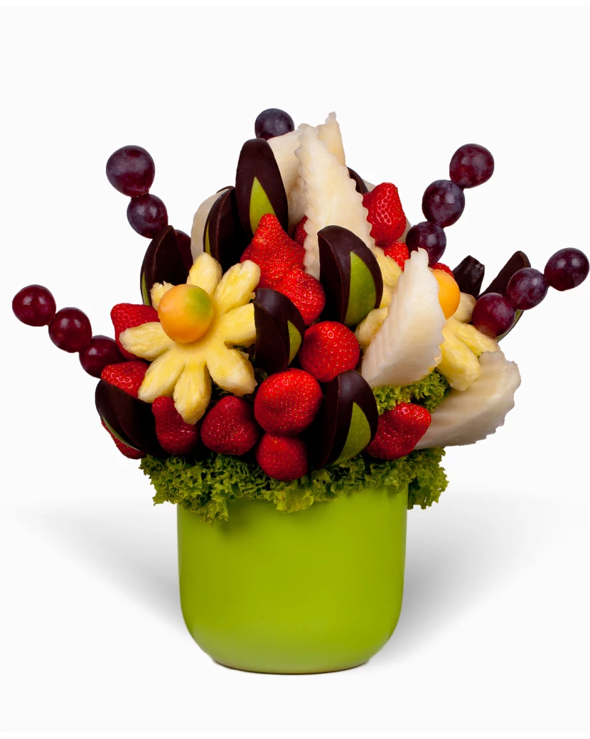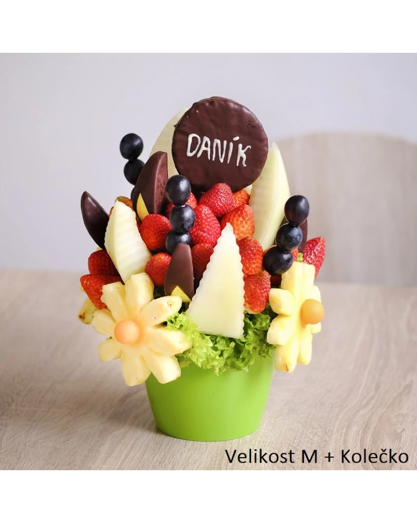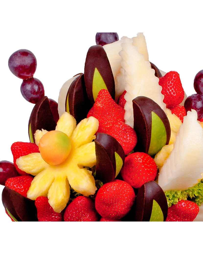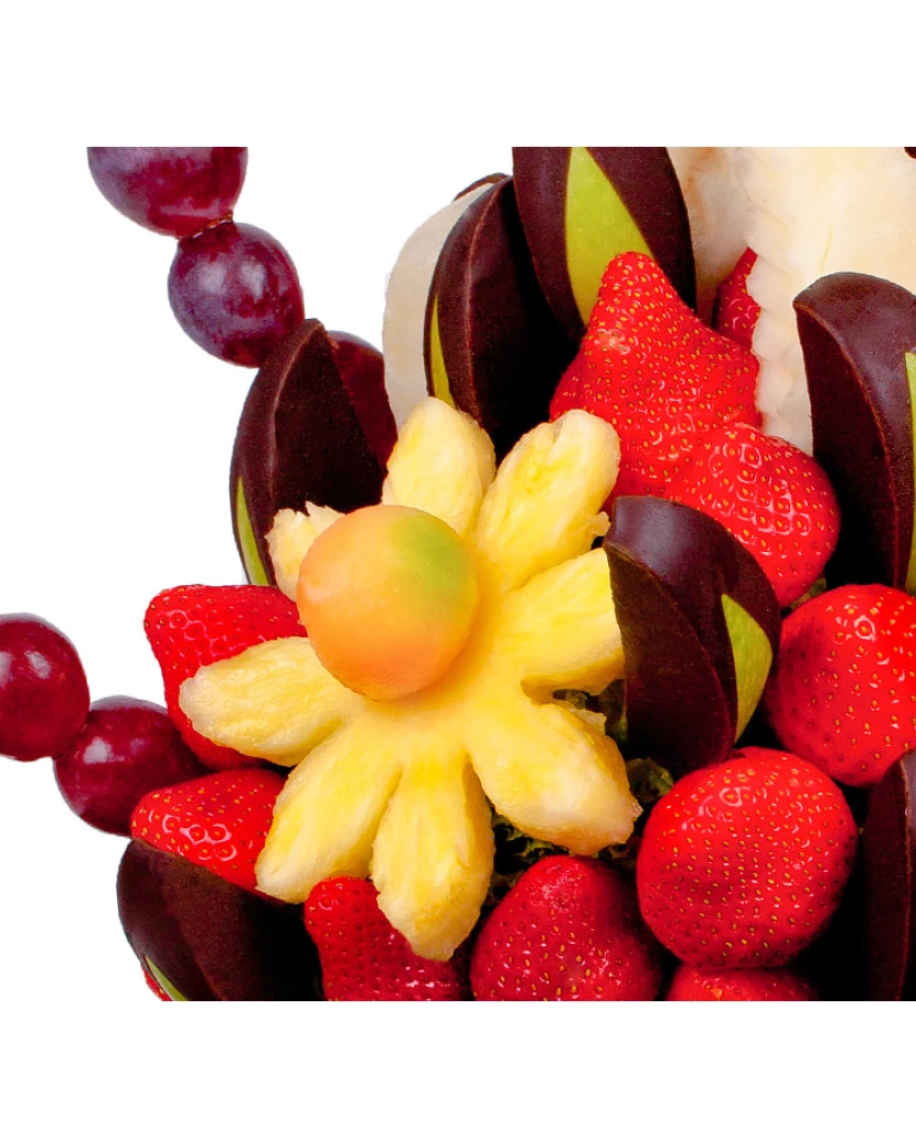 Kytice Sladký dárek překvapí Vaše blízké jako dárek k narozeninám, dárek k svátku či dárek k výročí. Tato sladká kytice, která v sobě skrývá lahodnou kombinaci medového melounu, šťavnatých jahod, ananasu, hroznového vína a zelených jablek zdobených hořkou čokoládou potěší jako originální dárek ke každé příležitosti. Navíc lze kytici ještě více personalizovat tím, že Vám do ní za malý příplatek přidáme ananasové kolečko nebo ananasové srdce namočené v hořké čokoládě, na nějž bílou čokoládou napíšeme jméno, číslo či krátký vzkaz. Sladký dárek tak může potěšit Vaše přátele, kolegy v práci, rodinu i kohokoli, kdo má rád ovoce!