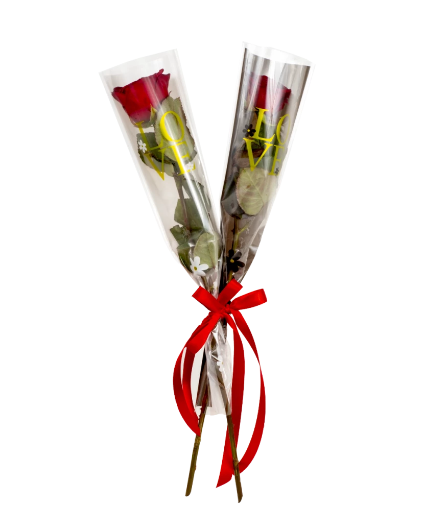 Jedna hezká červená růžička potěší každou ženu nejen na Valentýna. Tato je zabalená do průhledného celofánového obalu s bílým nápisem Love you.