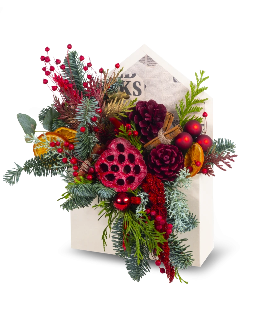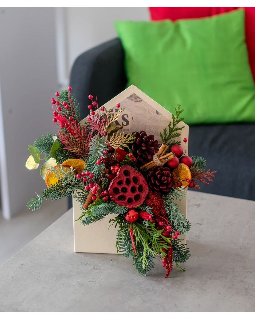 Vánoční obálka je originální kraftová krabička ve tvaru obálky, která přináší kouzlo Vánoc v elegantní přírodní podobě. Obsahuje voňavé jehličí, túji, sušené ovoce, sušené květiny a jemné vánoční ozdoby, díky nimž vytváří krásnou slavnostní dekoraci. Tento stylový aranžmá je zároveň i milým dárkem, který potěší každého obdarovaného. Doručujeme nepoškozené, krásně dárkově balené po celém Česku.
