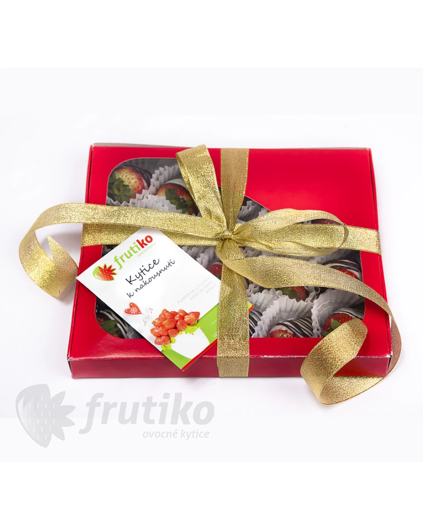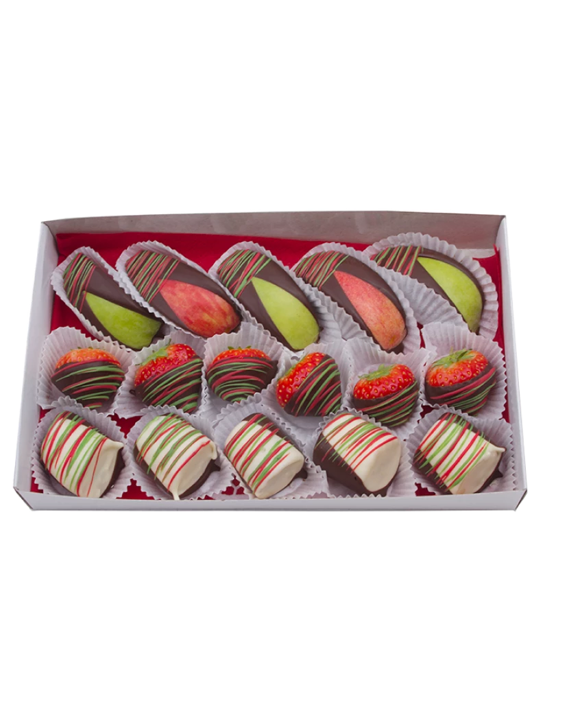 Vánoční Kolekce se skládá z čerstvého ovoce namočeného do kvalitní hořké a bílé čokolády a představuje originální vánoční dárek třeba jako zdravá alternativa k tradičnímu vánočnímu cukroví. Pošlete tuto netradiční bonboniéru z ovoce jako vánoční překvapení svým blízkým a známým přímo k nim domů. Ovocné bonboniéry obsahují kousky křupavých jablek Granny Smith namočených v hořké čokoládě a banánů a jahůdek v bílé čokoládě s barevným dekorem. Standardní bonboniéra obsahuje 15 kousků ovoce v čokoládě, velká bonboniéra pak 20 kousků. Podívejte se i na další květiny Praha.