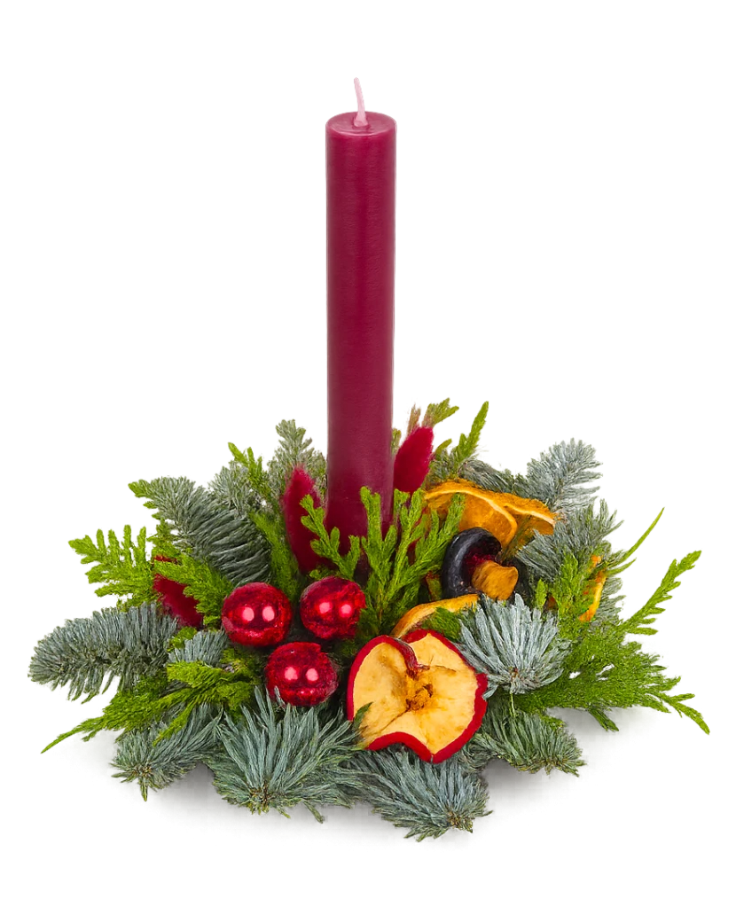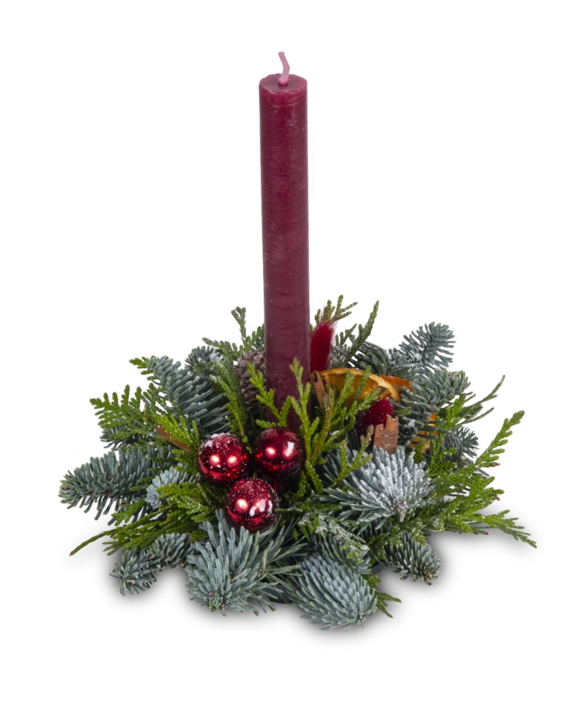 Vánoční svícen je malý přírodní dekorativní svícen s jednou svíčkou, tvořený voňavým jehličím, tújí, sušeným ovocem, sušenými květinami a jemnými vánočními ozdobami. Působí hřejivě, tradičně a dokonale doladí vánoční atmosféru v každém domově. Skvěle se hodí jako milý dárek – například v kombinaci s vánočním cukrovím či jinou sladkou pozorností. Čerstvě připravený svícen doručíme dárkově zabalený po celé České republice.