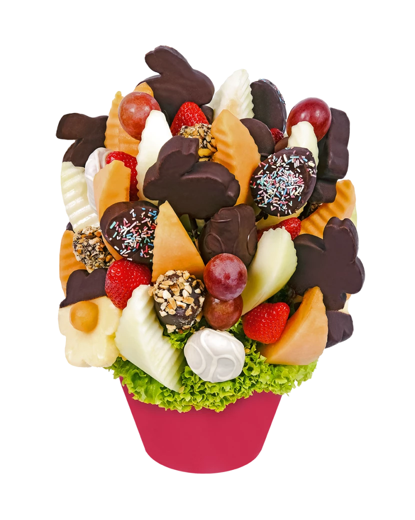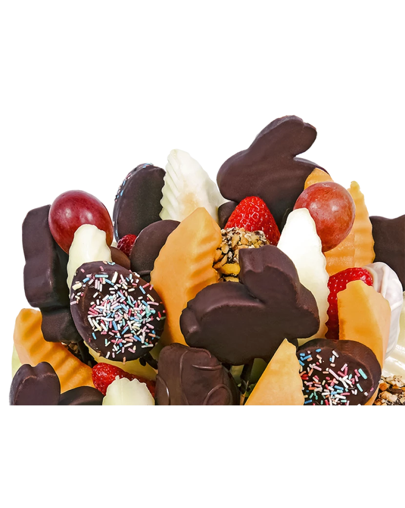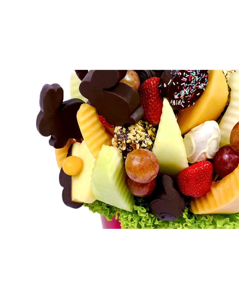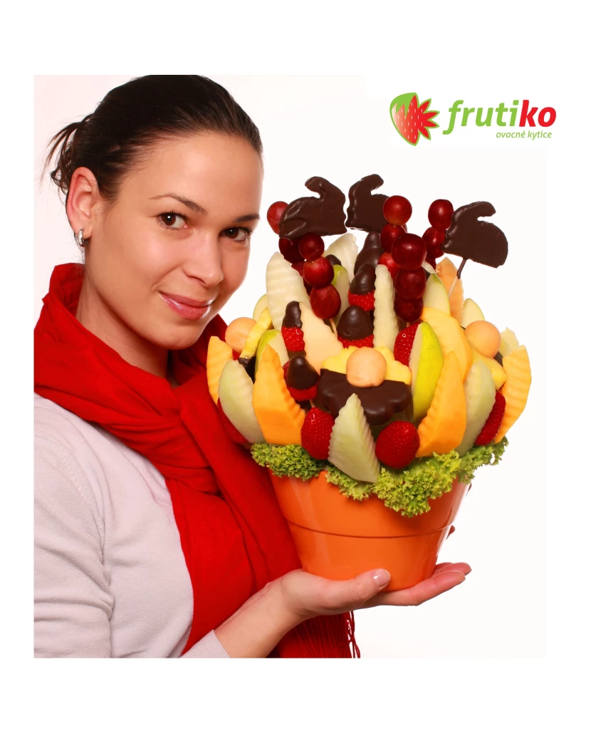 Velikonoční pomlázka je lahodná kytice z čerstvého ovoce a čokolády, která se skvěle hodí jako velikonoční dárky a dobroty. Obsahuje meloun cukrový a kantalup, ananas, hroznové víno, jahody, jablka a Velikonoční zajíčky a velikonoční vajíčka z ananasu v čokoládě.