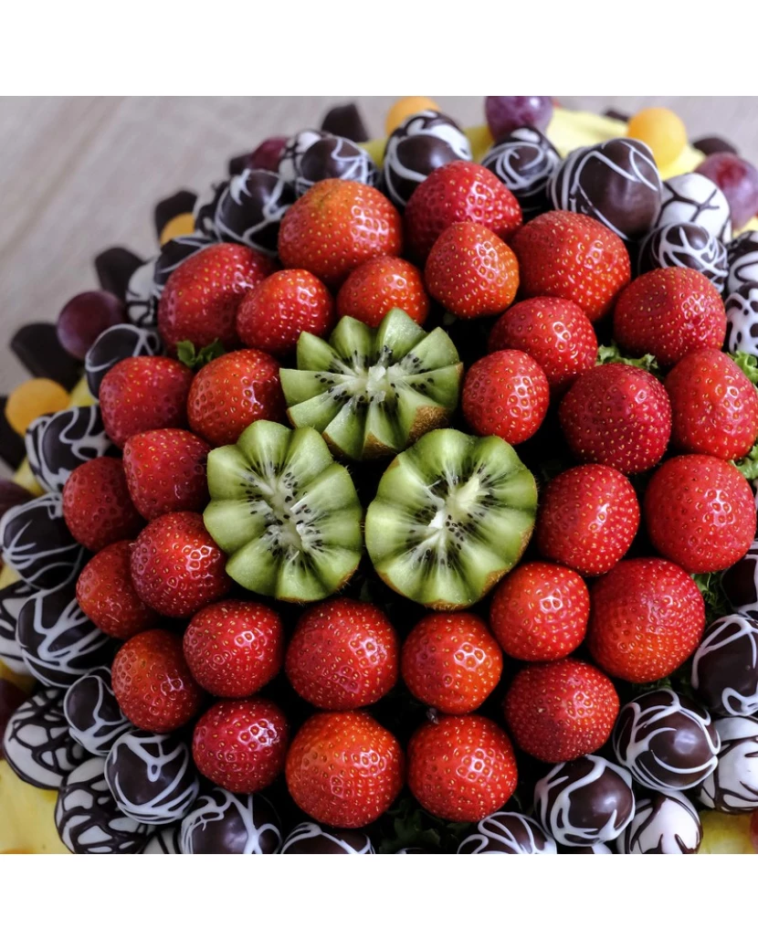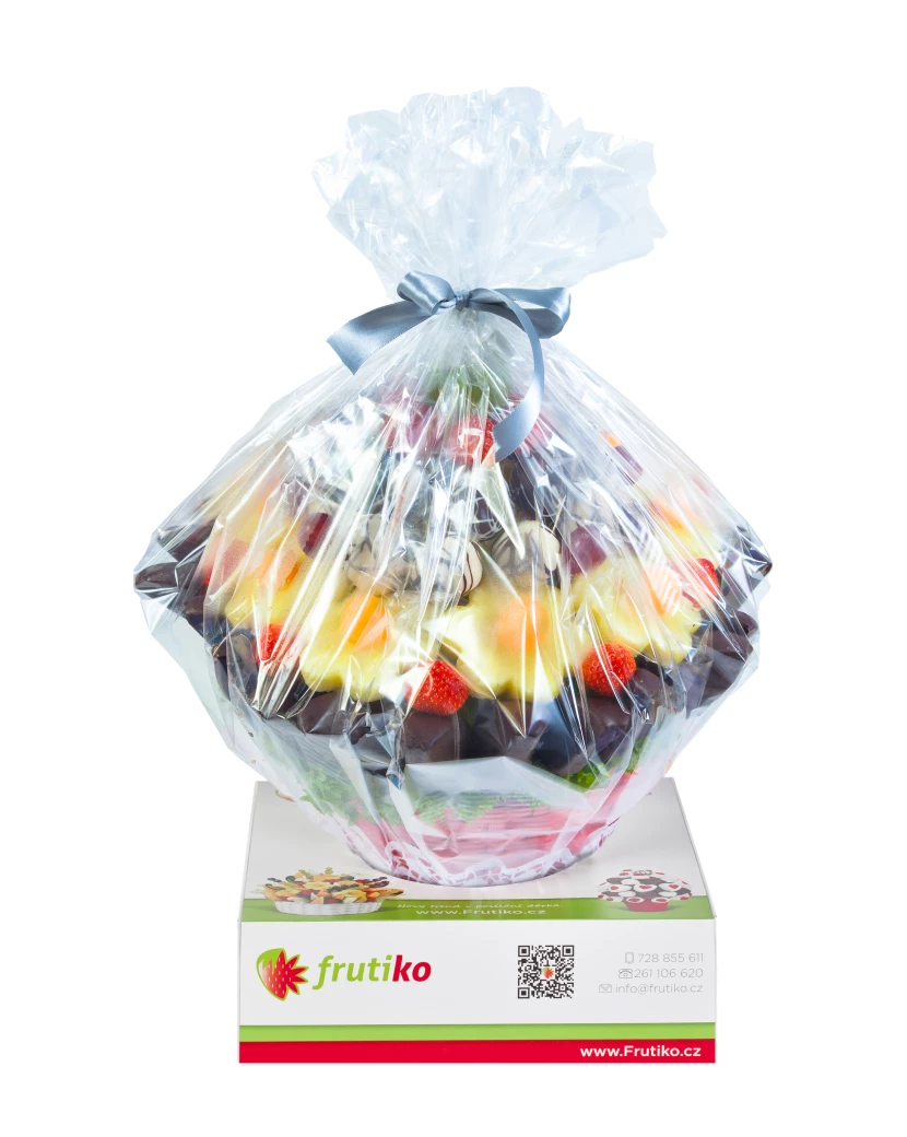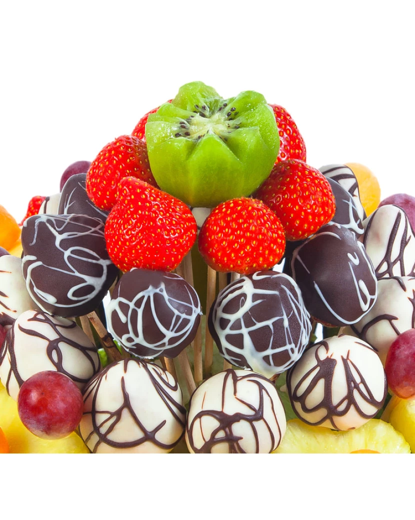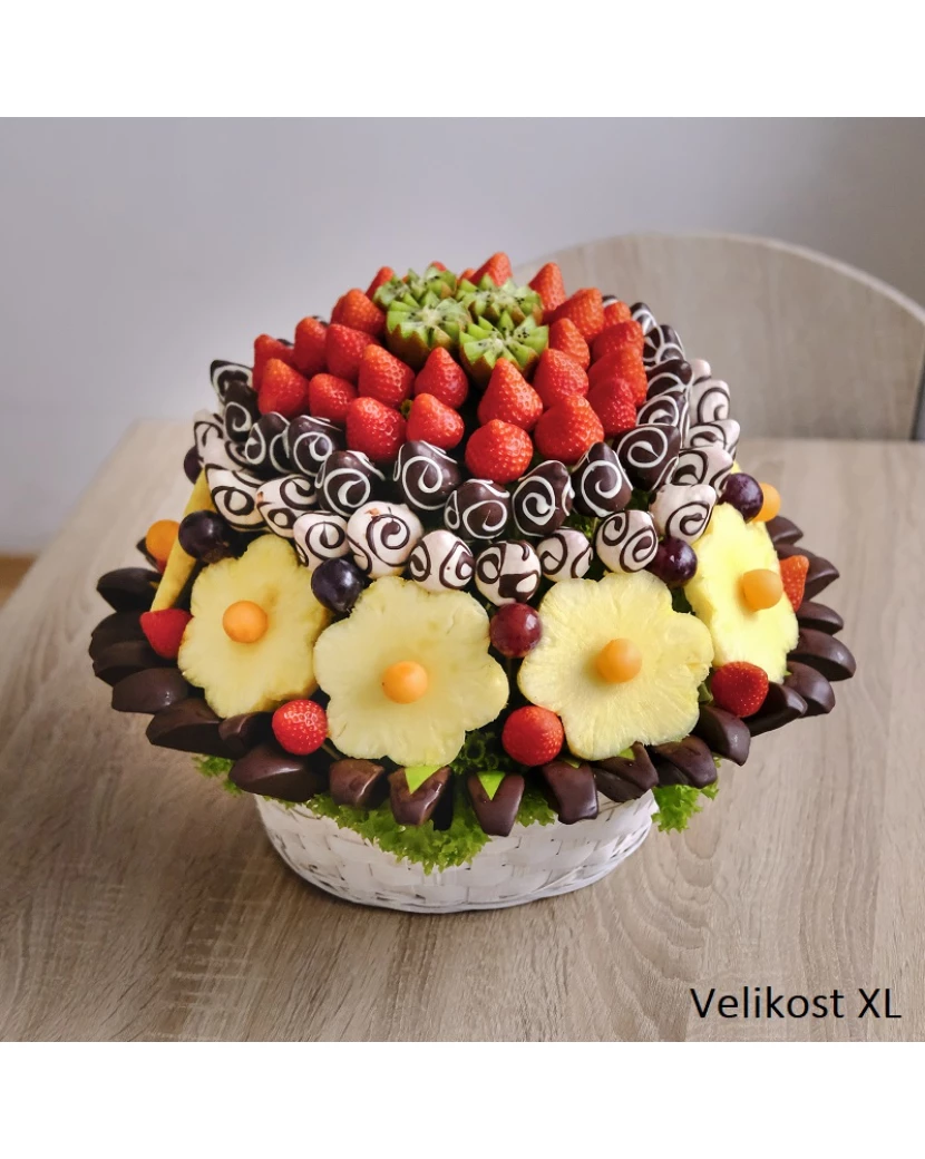 Krásná ovocno-čokoládová kytice Veselá oslava je vyrobená z čerstvého ovoce jako jablíčka Granny Smith, jahody, ananas a kiwi s kousky ovoce zdobenými bílou a tmavou belgickou čokoládou Callebaut. Kytice Veselá oslava je vhodná nejen jako dárek k výjimečné události ale také jako občerstvení a dekorace na rodinnou oslavu.